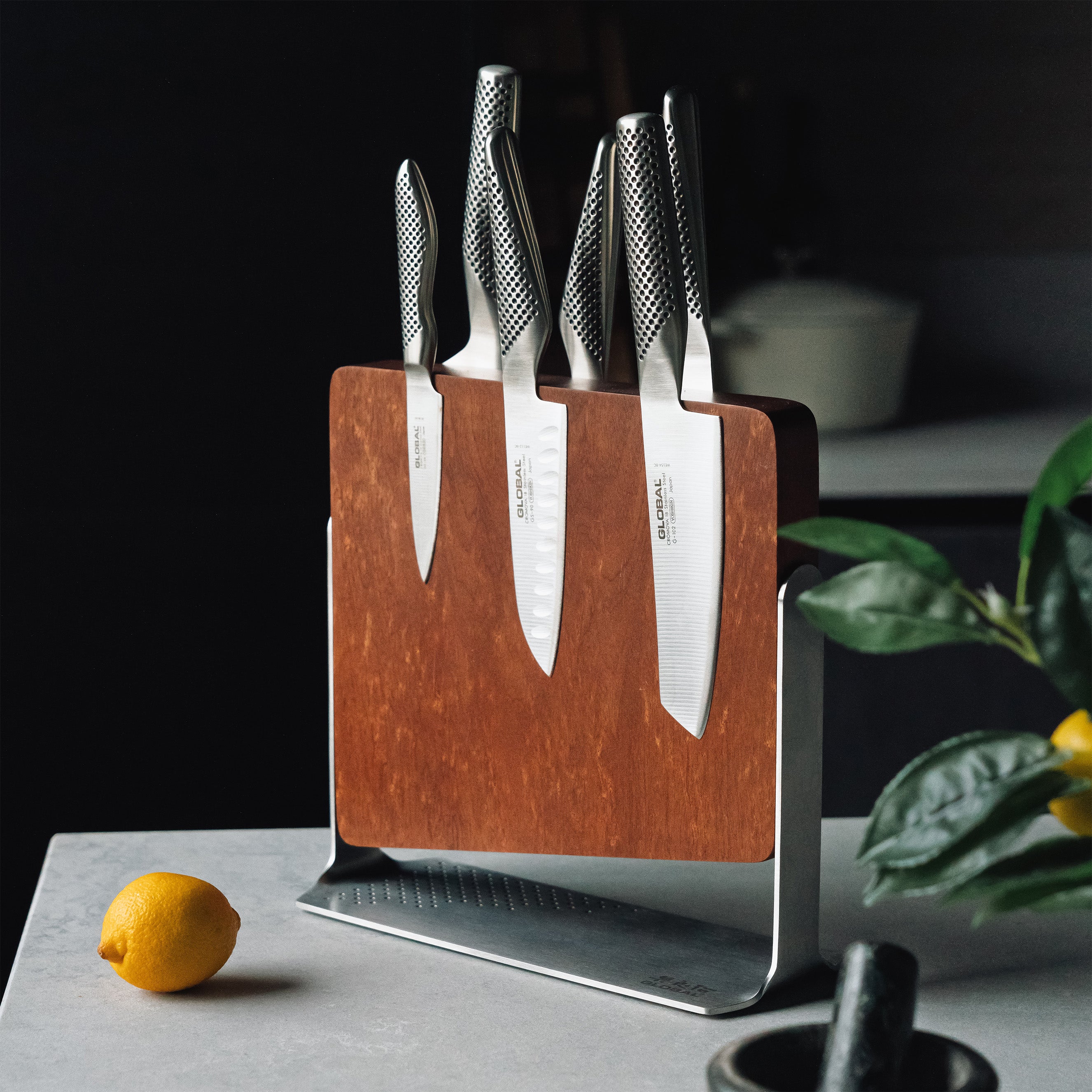 The 5 Piece Knife set comes with a Global branded magnetic rack and 4 Global Knives. The magnetic rack will attach to a wall and the knives included will fit comfortably. A fantastic and handy way to display your knives.