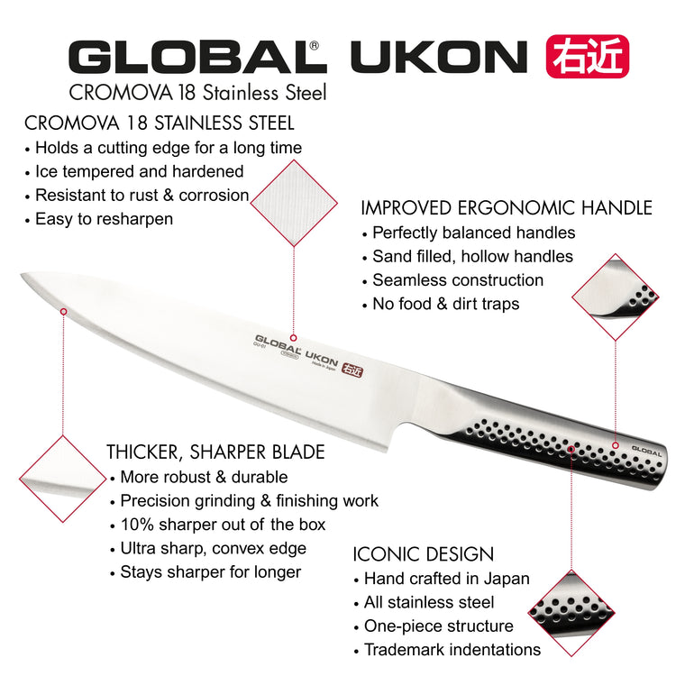 In true GLOBAL tradition, the knife is constructed from the best Stainless Steel material and the UKON series features thicker blades to enhance performance. UKON knives are subject to even more precise grinding and finishing work, making them 10 percent sharper out of the box. The knives are designed with an ambidextrous thumb rest that sits closer to the blade for added control and efficiency. The underside of the handle features GLOBAL's trademark indentations, making UKON knives extremely comfortable to hold.