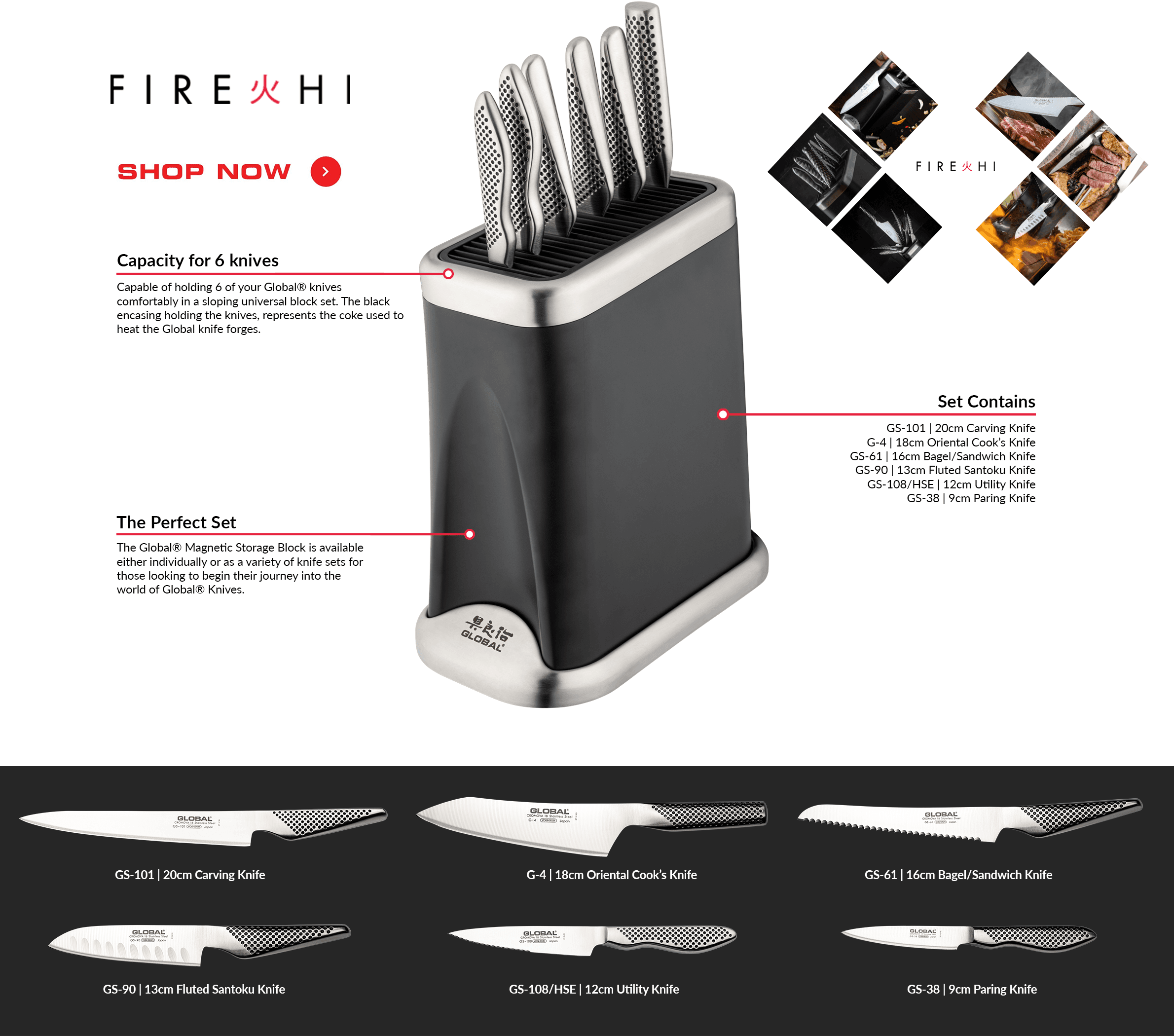 The Japanese fire element symbolizes life, passion, desire, and energy, crucial in cooking and reflecting inner emotions. Our Hi block set gracefully cradles your Global knives, mirroring the coke used in knife forges. Fire in cuisine is embodied by meat. Our set includes the G-4 and GS-101 knives, blending tradition and precision.