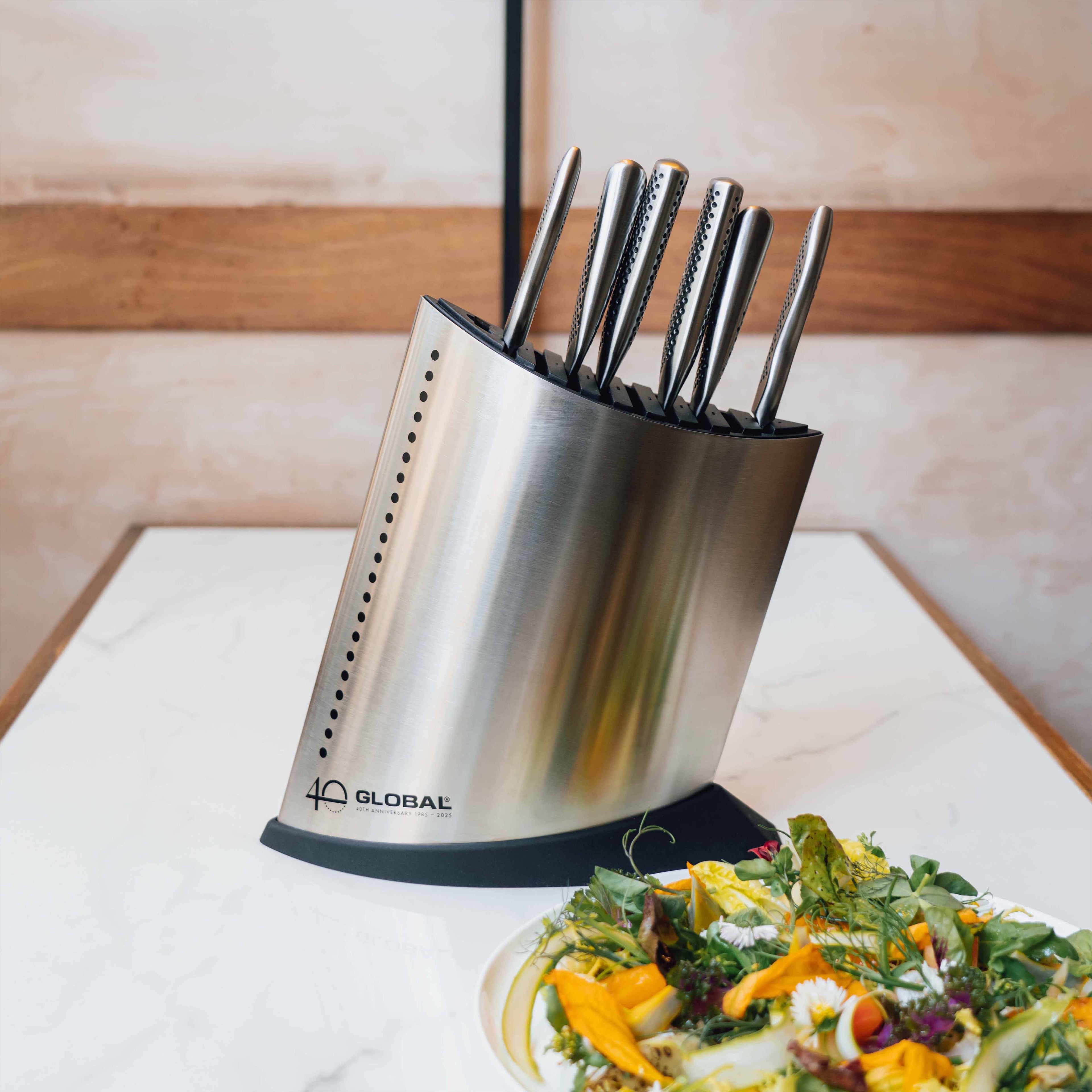 The Japanese wind element symbolizes freedom, growth, and expansion, mirroring both air and the human intellect. Our Kaze knife block set, suspending Global knives, embodies this liberty by allowing flexible additions to the collection. Inspired by poultry, these knives boast fluted designs to prevent food from adhering to the blades.