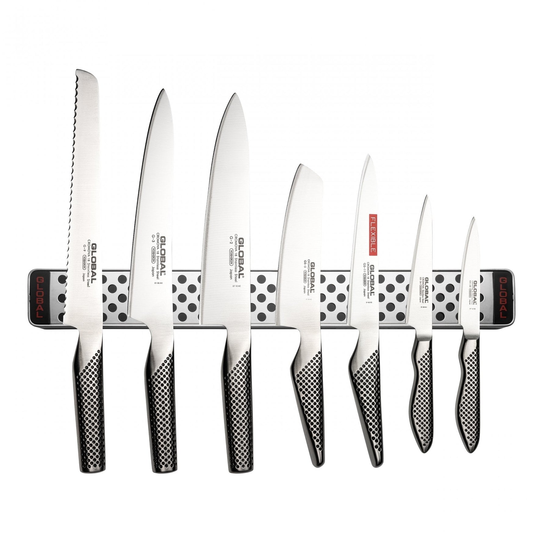 Global 40cm magnetic knife rack with 7 Global knives. This set contains a really thorough collection of knives for the best home chefs. The set contains a chef's knife, carving knife, bread knife, vegetable chopper, utility and two smaller paring knives.