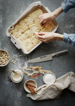 The G-46 Santoku Knife 18cm is Global's full sized Santoku knife. Santoku is a Japanese word literally meaning 'three ways' and is used to describe the three cutting tasks that the knife is designed to do; slicing, dicing and mincing. The shape of the knife makes it brilliant for Western style cooking as the blade is flat, deep and powerful, which makes the knife really good for cutting up lots of heavy root vegetables, such as sweet potato, squashes and celeriac.