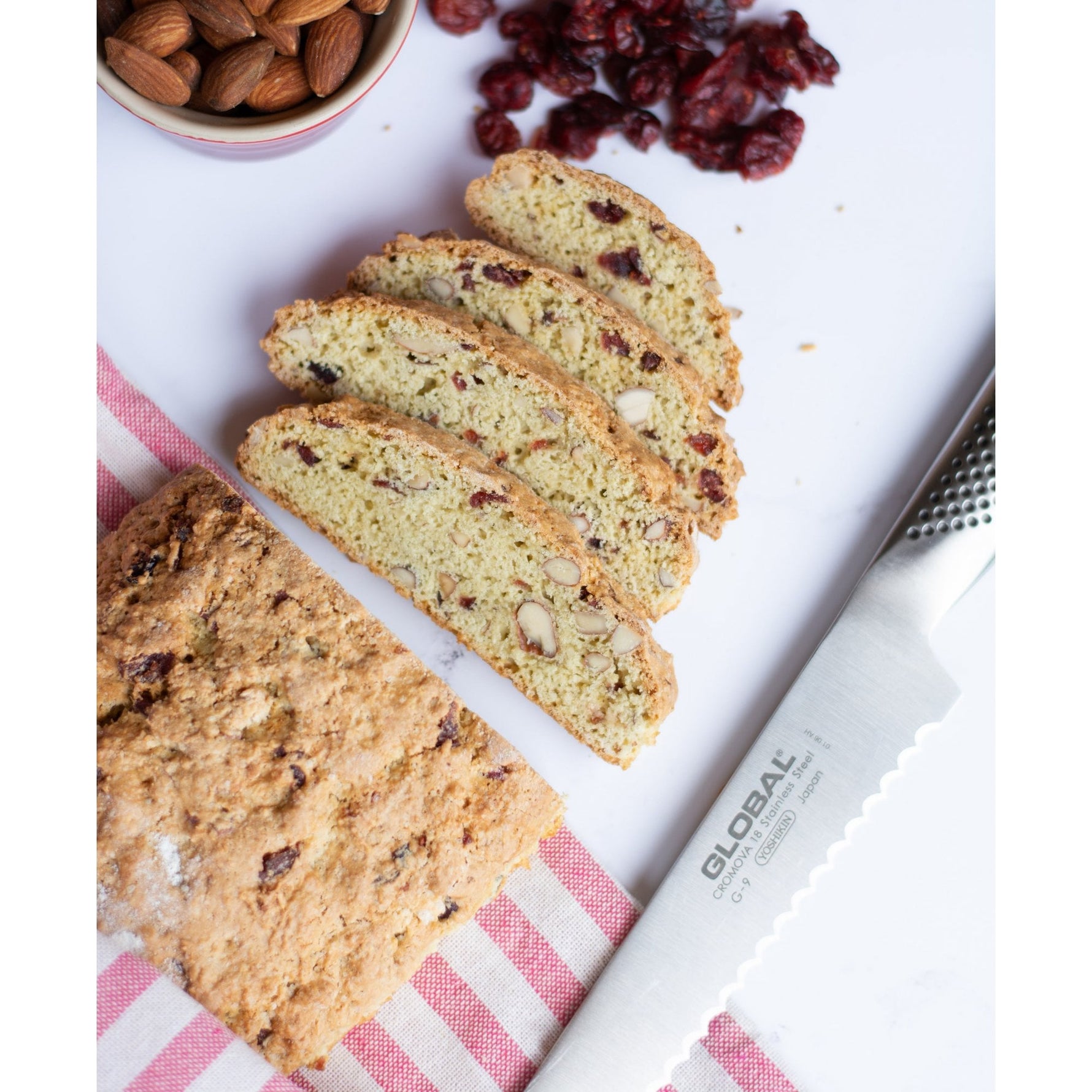 If you look closely at the knife blade you will see that on the face of the knife, the teeth have a chamber whilst on the back of the knife, the face is flat. When you cut into bread, you will automatically cut inwards in a curve rather than straight down and the chamber is there to help correct this so that your slicers will be more of a similar thickness all the way through. Whilst the G-9 can be used by left handers, the set up is right handed. Global can provide left handed bread knives on request. There is also a fluted version, the G-68.