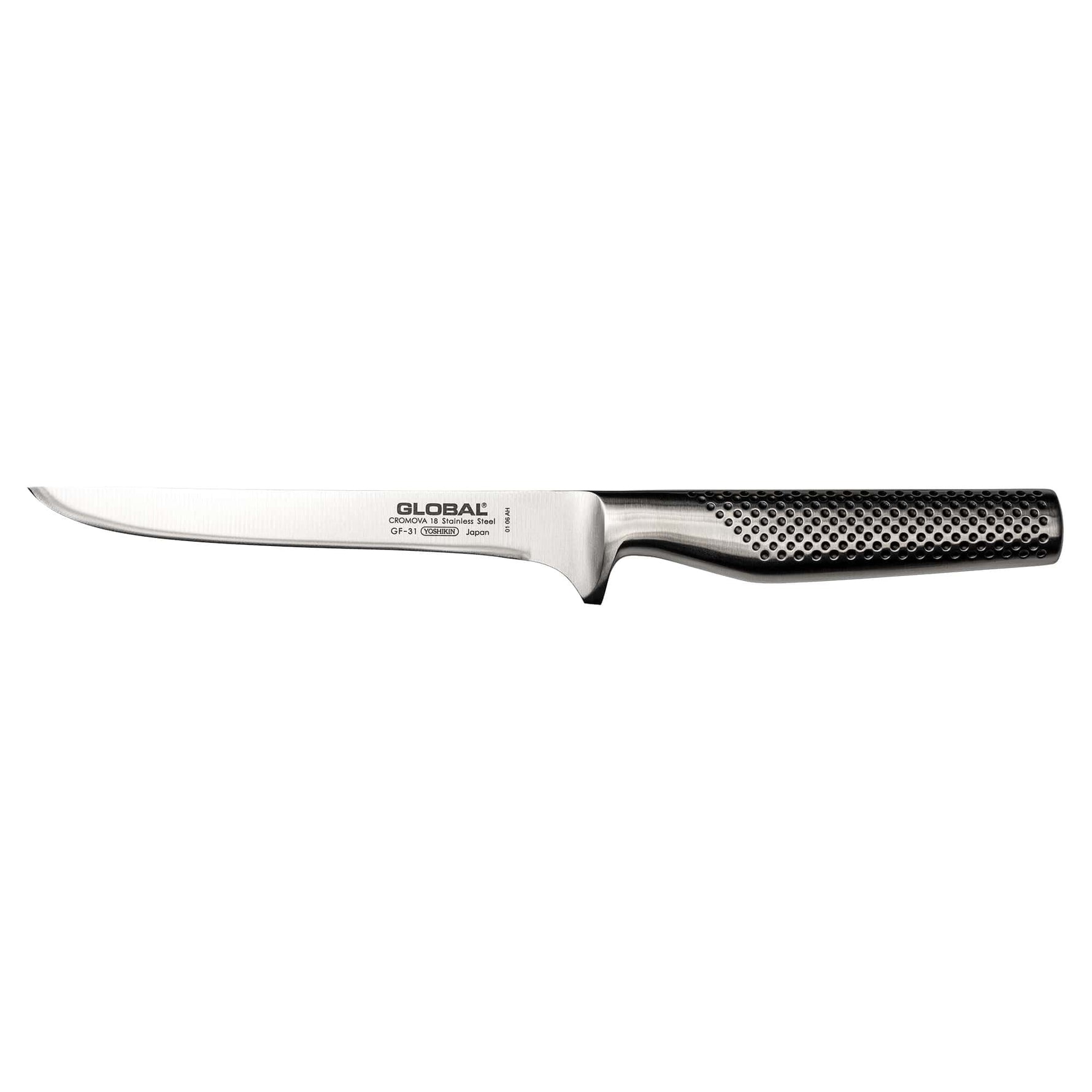 The GF-31 is essentially the fully forged version of the more popular G-21 Boning knife. Both knives have long thin blades which make the knife good for getting between the skin and the meat of the fish. The main difference between the two knives is the addition of a bolster. The bolster gives a lot of extra protection by preventing hands from slipping forward onto the blade. The main drawback is the fact that this blade is not as flexible. There is a trade off between the strength of the fully forged blade and have a flexible knife. This makes the knife better for more regular use, in professional kitchen settings, where repeated use of the boning knife is needed.