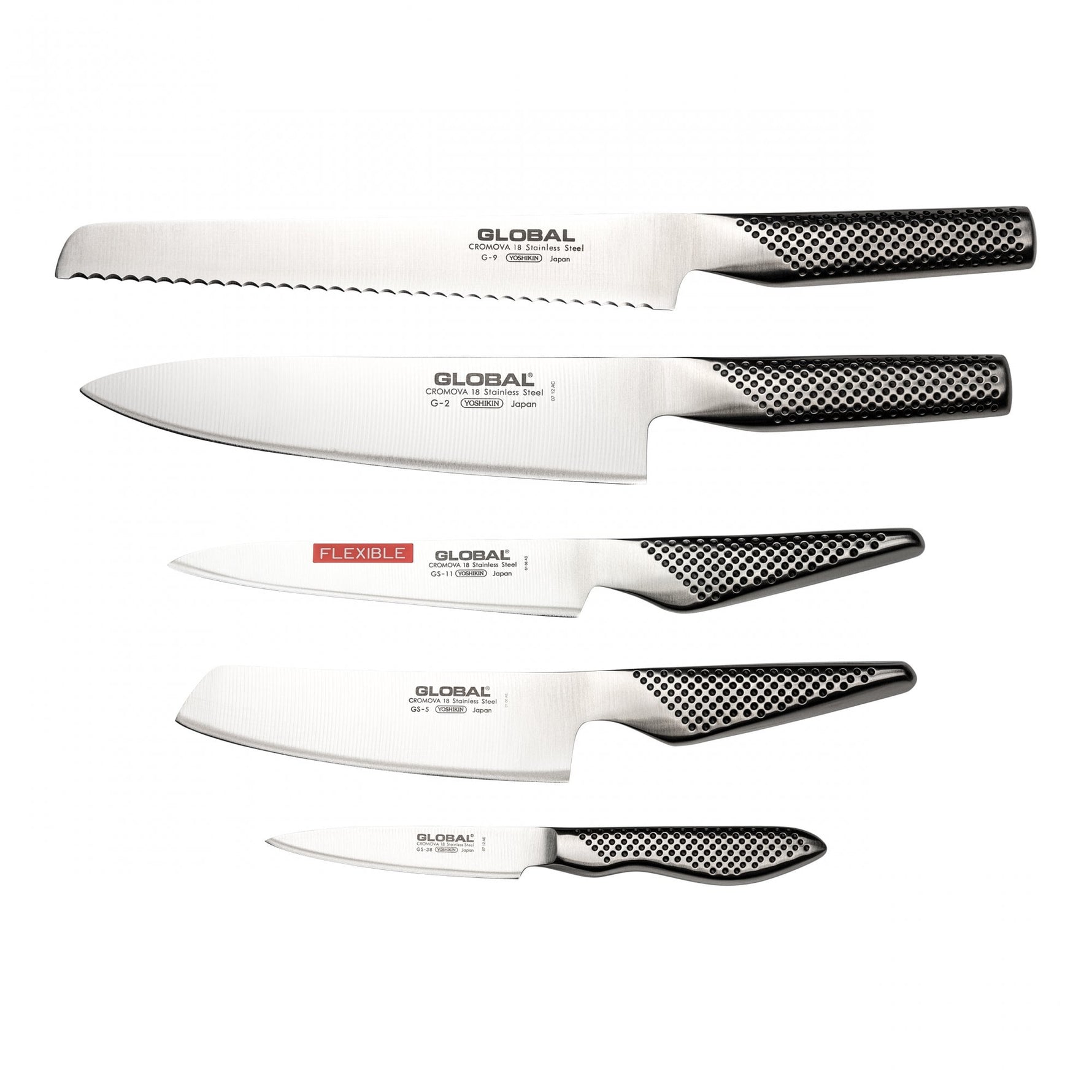 The 5 Piece Knife set includes all your kitchen essentials. A great range of knives for the professional chef or avid home cook. This set includes a G-2 20cm Chef's Knife, G-9 20cm Bread Knife, GS-5 14cm Vegetable Knife, GS-11 15cm Flexible utility Knife and GS-38 9cm Paring Knife.