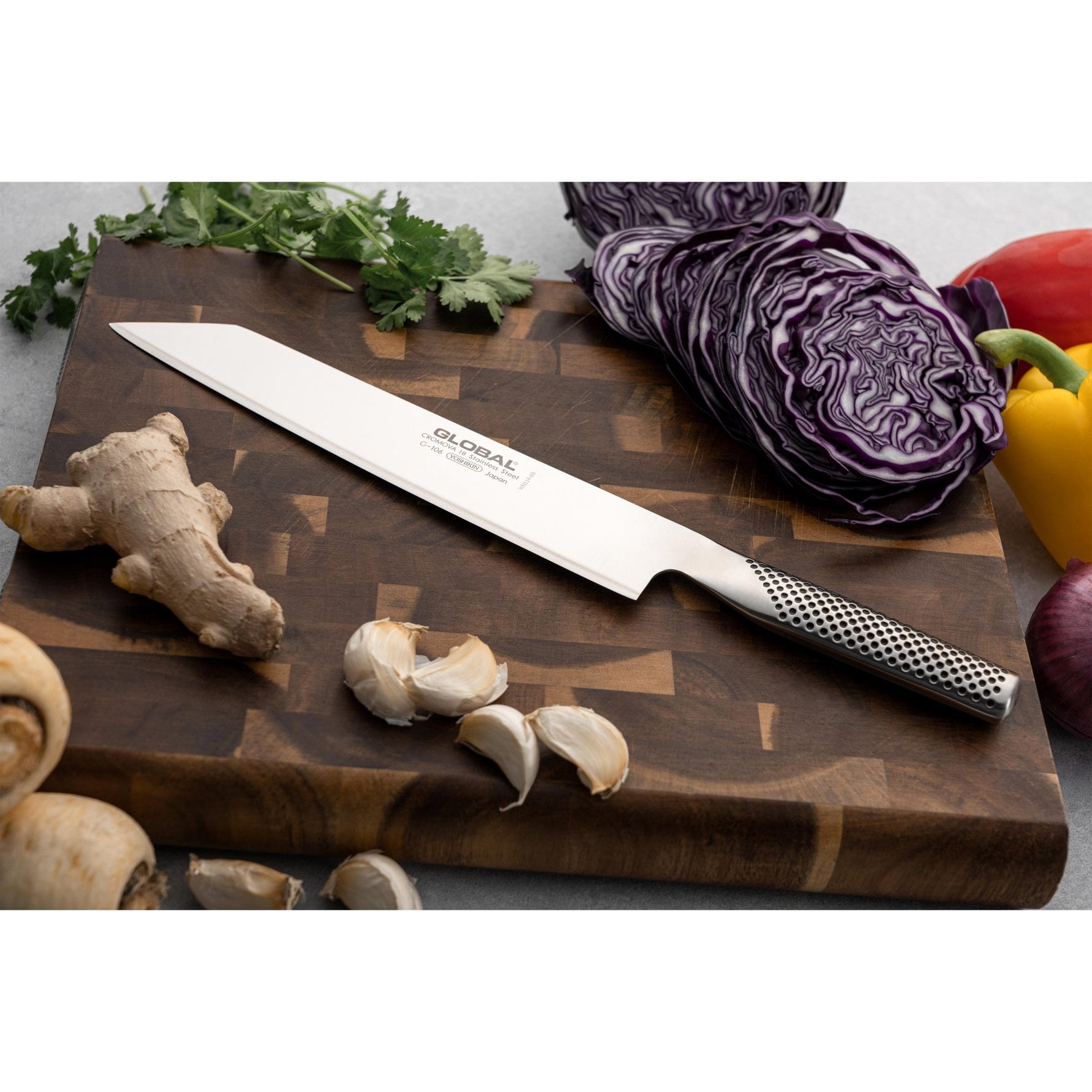 Feeding off this tradition, Global ® Knives proceeded to engineer a Double-Edged version of the Kiritsuke in their Classic series to fashion a very versatile knife. This knife can be used to perform most of the tasks normally done with a Gyuto or Chef’s Knife, but also those of the Nakiri and Sujihiki. It has less curvature than the typical Gyuto, making it less suited for “rocking action chopping” but perfect for a “push and pull” cutting action. The tip of the blade is particularly suitable for fine dicing and chopping.