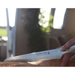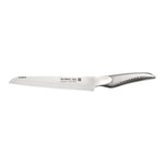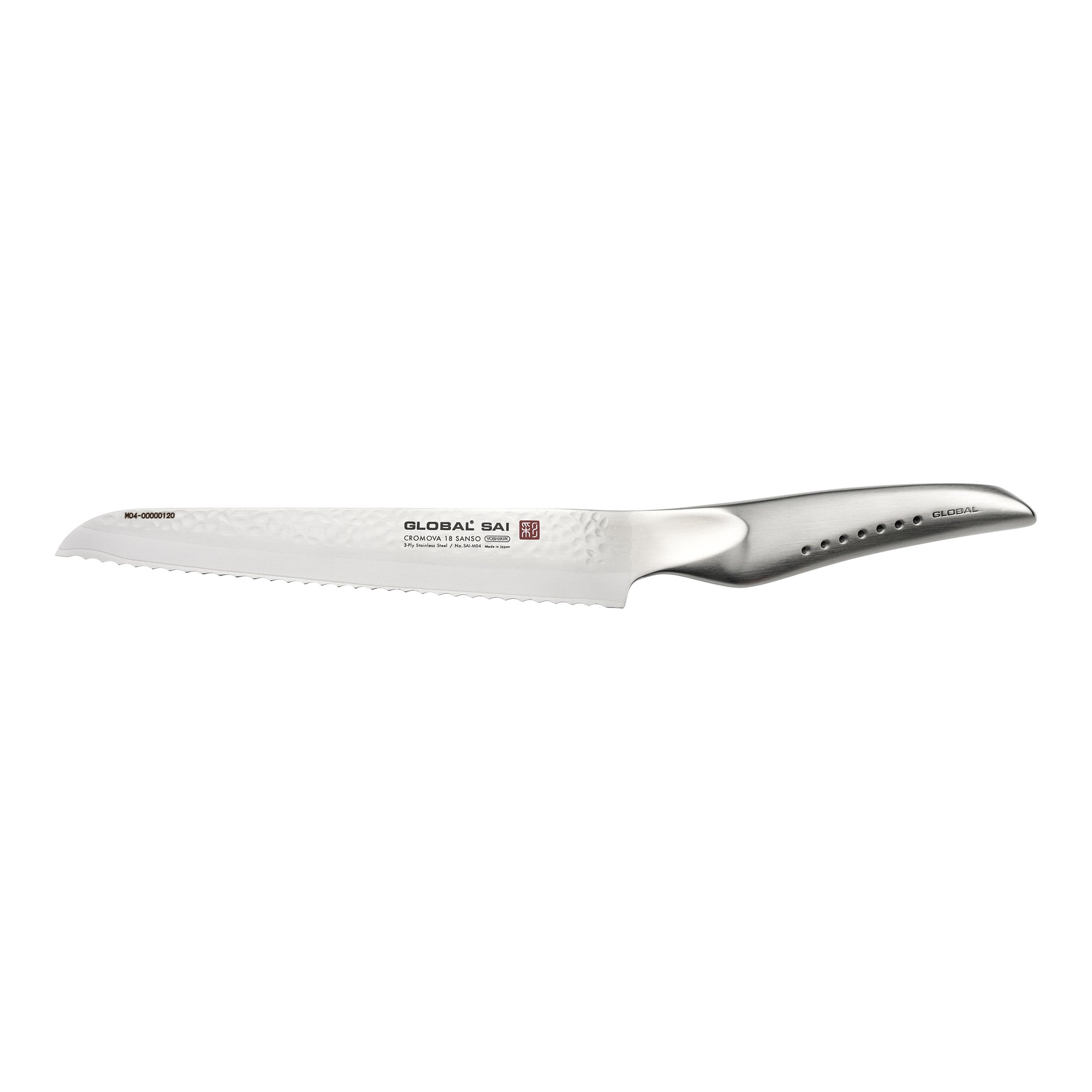 Global SAI's bread knives are designed to cut through the crustiest loaves of bread, This bread knife is quite long and does not fit in the medium and small size Global blocks. If you are looking to add a bread knife to a block set, try the SAI-M04 which has only a 17cm blade.