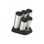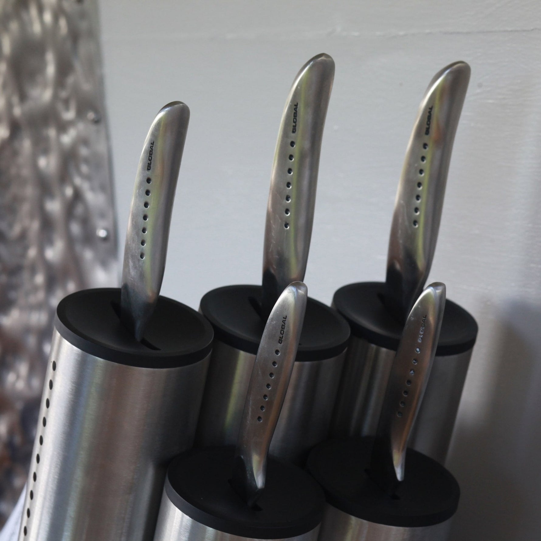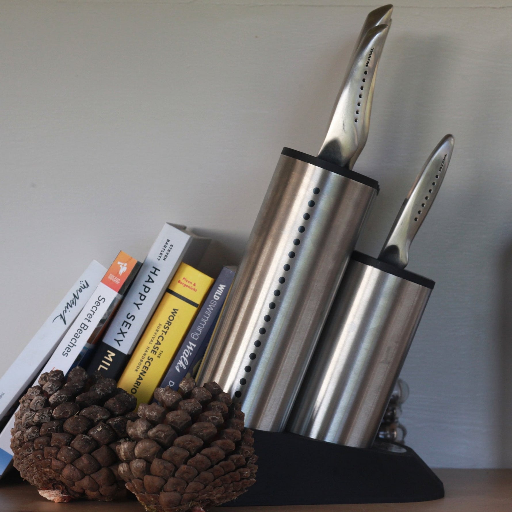 The ‘Team SAI’ knife block features 5 stainless steel cylinders made from the finest 18/10 material. This premium set includes an SAI-01 Chef’s knife, SAI-05 Bread knife, SAI-M06 Vegetable knife, SAI-S02 Utility knife and SAI-S01 Paring knife.
