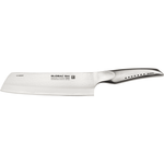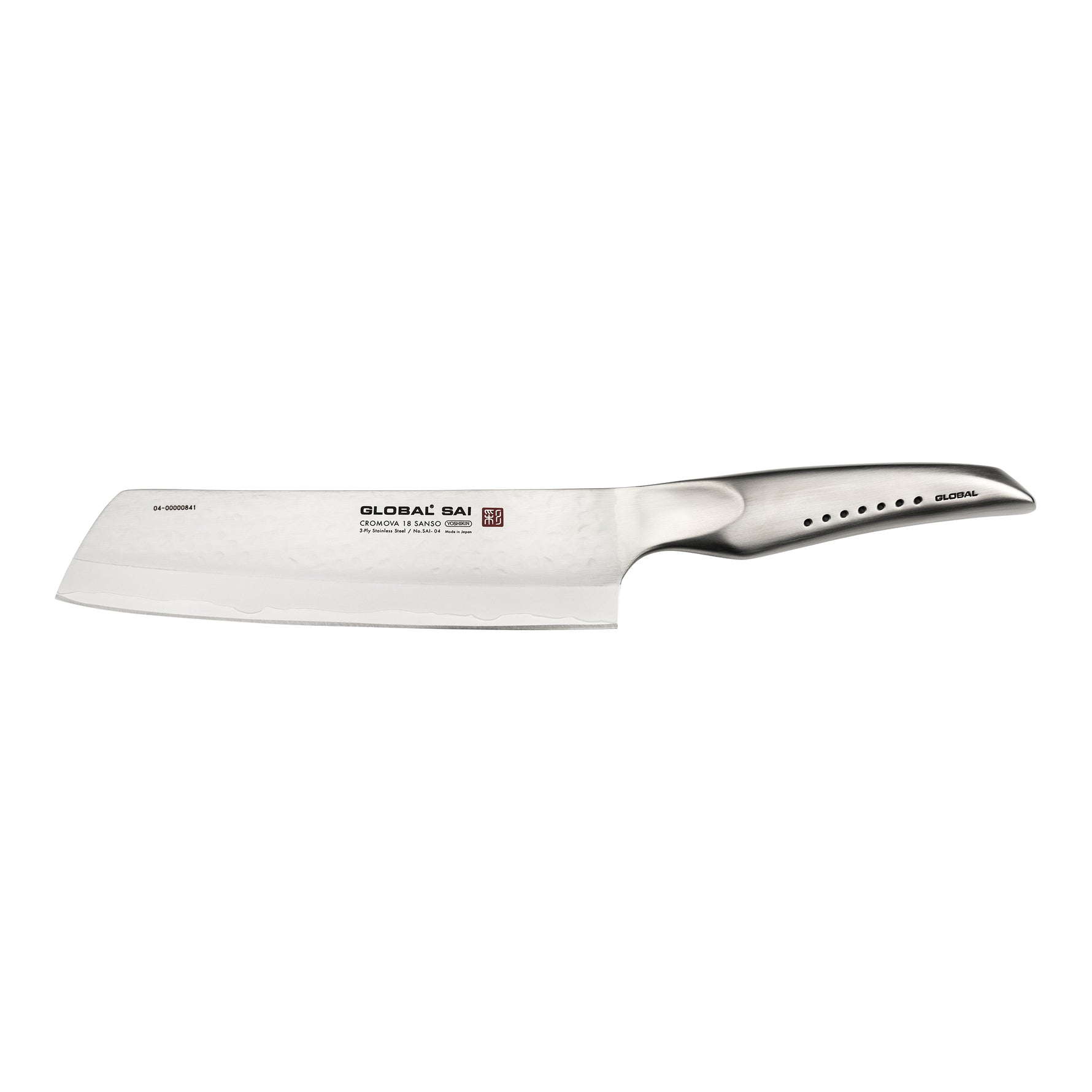 Global SAI has two vegetable knvies in its range. The SAI-04 is a specialist vegetable chopping knife. It has a long flat blade designed to get a clean cut when the knife cuts down onto the board. It is quite a heavy knife and suitable for long hours in the kitchen. With its long 19cm blade and the stretched handle of the SAI series, the SAI-04 knife is the largest vegetable chopper Global produce. It has a smaller brother the SAI-M06, which home users will find a bit more manageable as it has only a 15cm length. This makes it more similar to the popular G-5