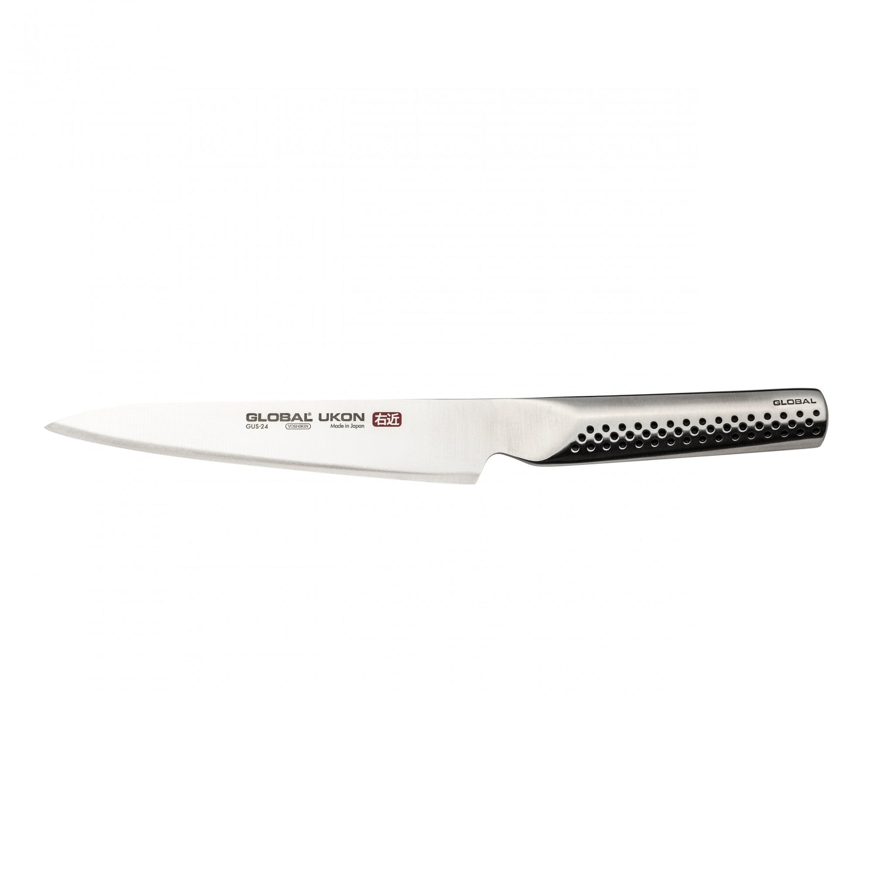 The Global Ukon GUS-24 Utility Knife is great for chopping smaller foods such as shallots, avocado and cheese. This multiskilled knife shares many qualities of a chef’s knife but is well suited to working with smaller food items, allowing for more precise, delicate cutting work. The GUS-24 Utility Knife is also useful as a small carving knife.