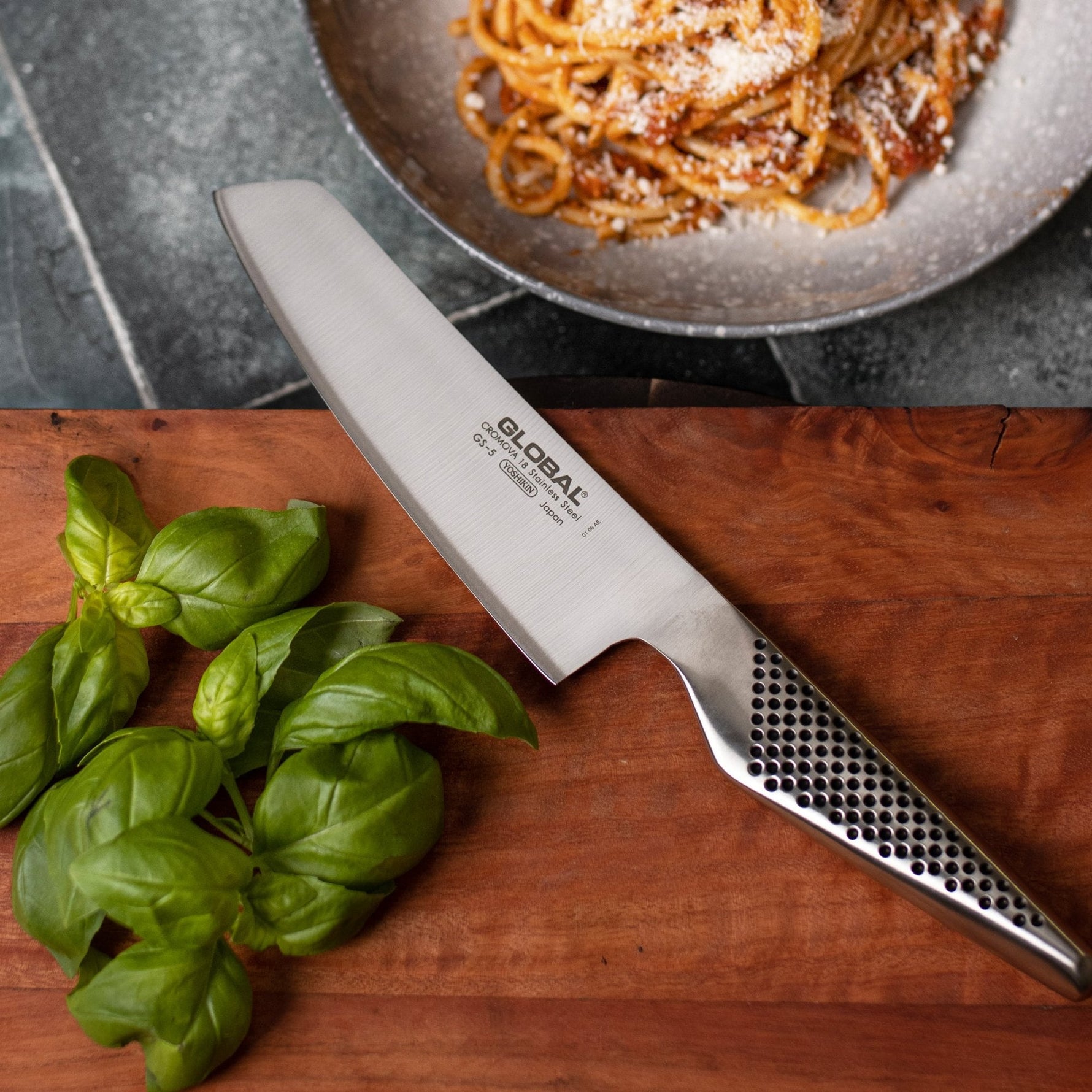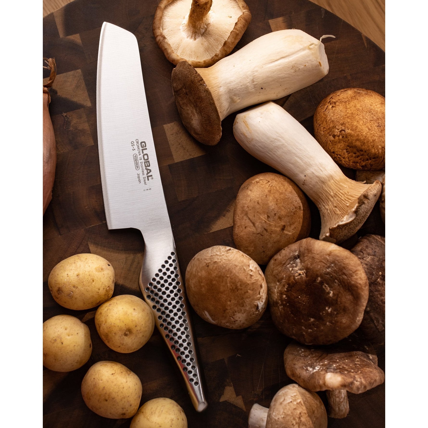 The GS-5 is the little brother of the G-5 vegetable chopper, with the same shape of blade in a smaller proportion. These knives take their inspiration from Japanese Usaba (Vegetable Knives), the relatively flat parts of the blade are designed to chop through fruit and vegetables and come into full contact with the chopping board and give a clean cut. The front of the blades are more curved like a chef's knife, to allow the knife to be rocked gently forward after each cut and encourage good technique. A really popular blade often found in Global sets, the GS-5 is also available in a fluted style as the GS-39.