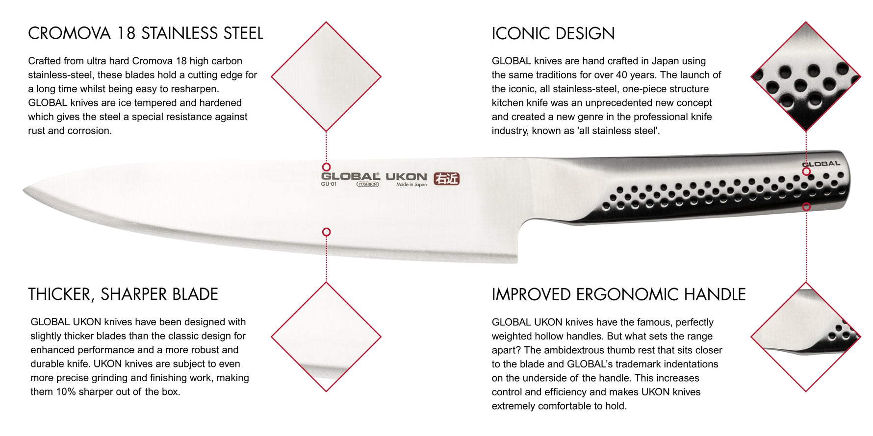 In true GLOBAL tradition, the knife is constructed from the best Stainless Steel material and the UKON series features thicker blades to enhance performance. UKON knives are subject to even more precise grinding and finishing work, making them 10 percent sharper out of the box. The knives are designed with an ambidextrous thumb rest that sits closer to the blade for added control and efficiency. The underside of the handle features GLOBAL's trademark indentations, making UKON knives extremely comfortable to hold.