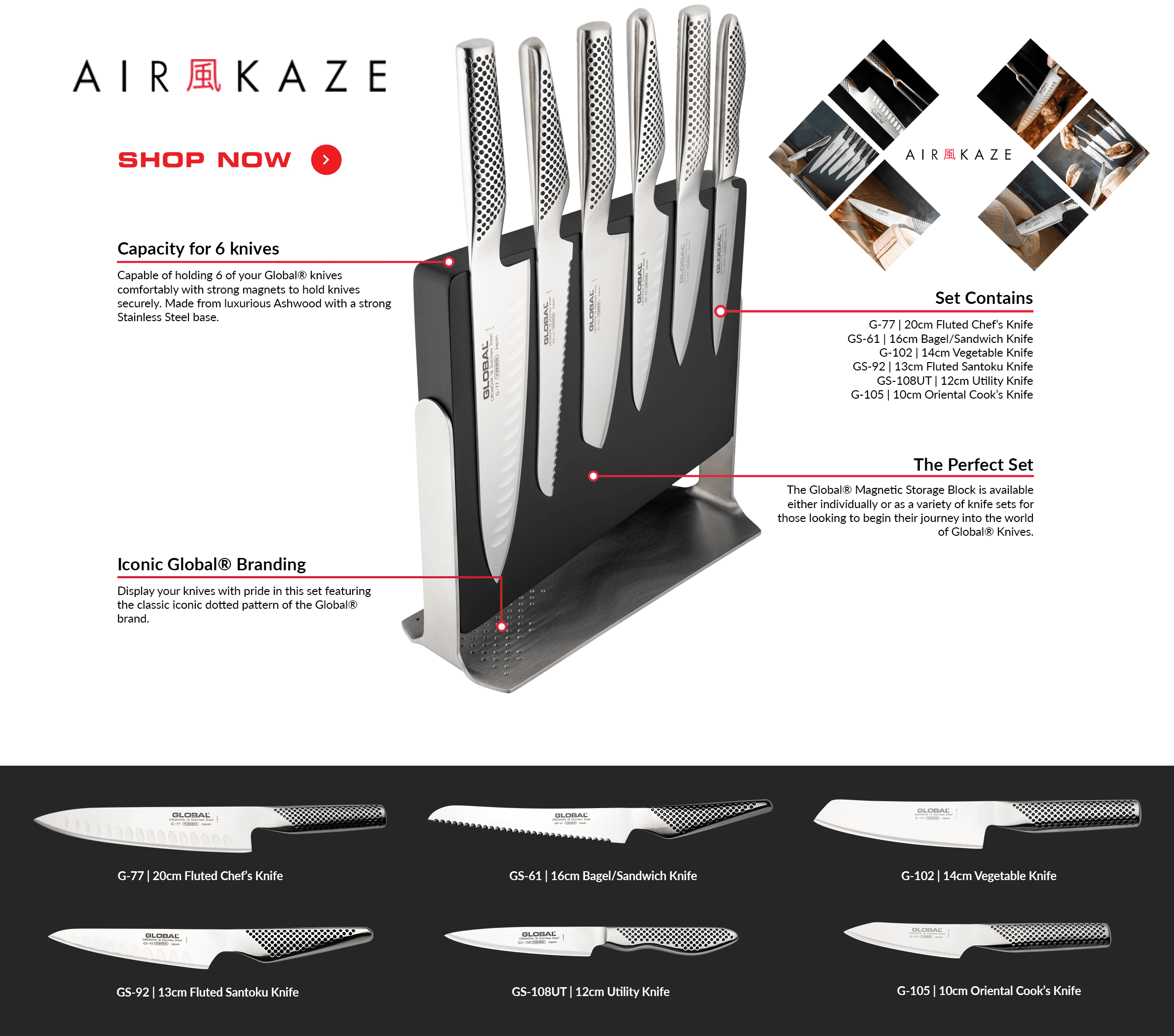 The Japanese wind element symbolizes freedom, growth, and expansion, mirroring both air and the human intellect. Our Kaze knife block set, suspending Global knives, embodies this liberty by allowing flexible additions to the collection. Inspired by poultry, these knives boast fluted designs to prevent food from adhering to the blades.