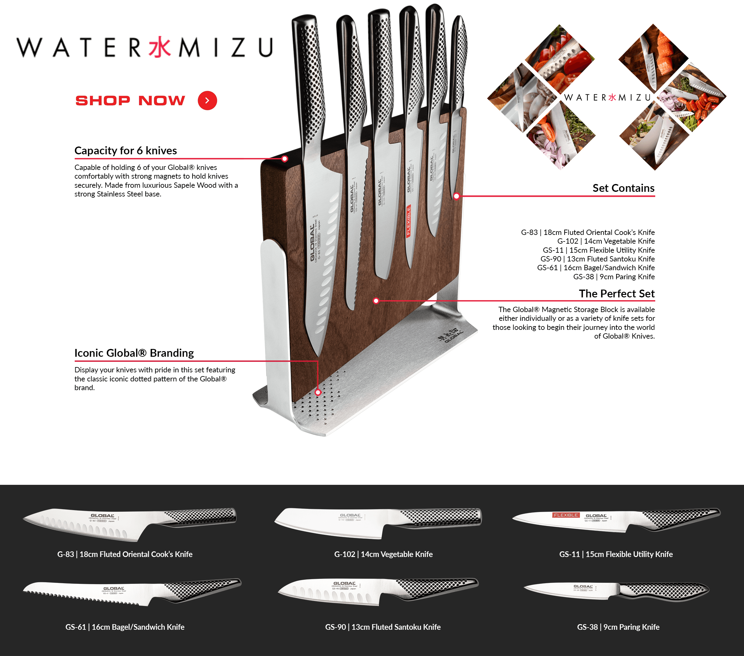 All Global ranges use a stainless steel handle, a feature that has become the brand's trademark. Global knives are famous the world over for their outstanding design, performance and ease of use in both home and professional settings. Still the market leader.to which all other brands are compared. Choose from their 3 ranges, Global Classic, Ni and Sai.