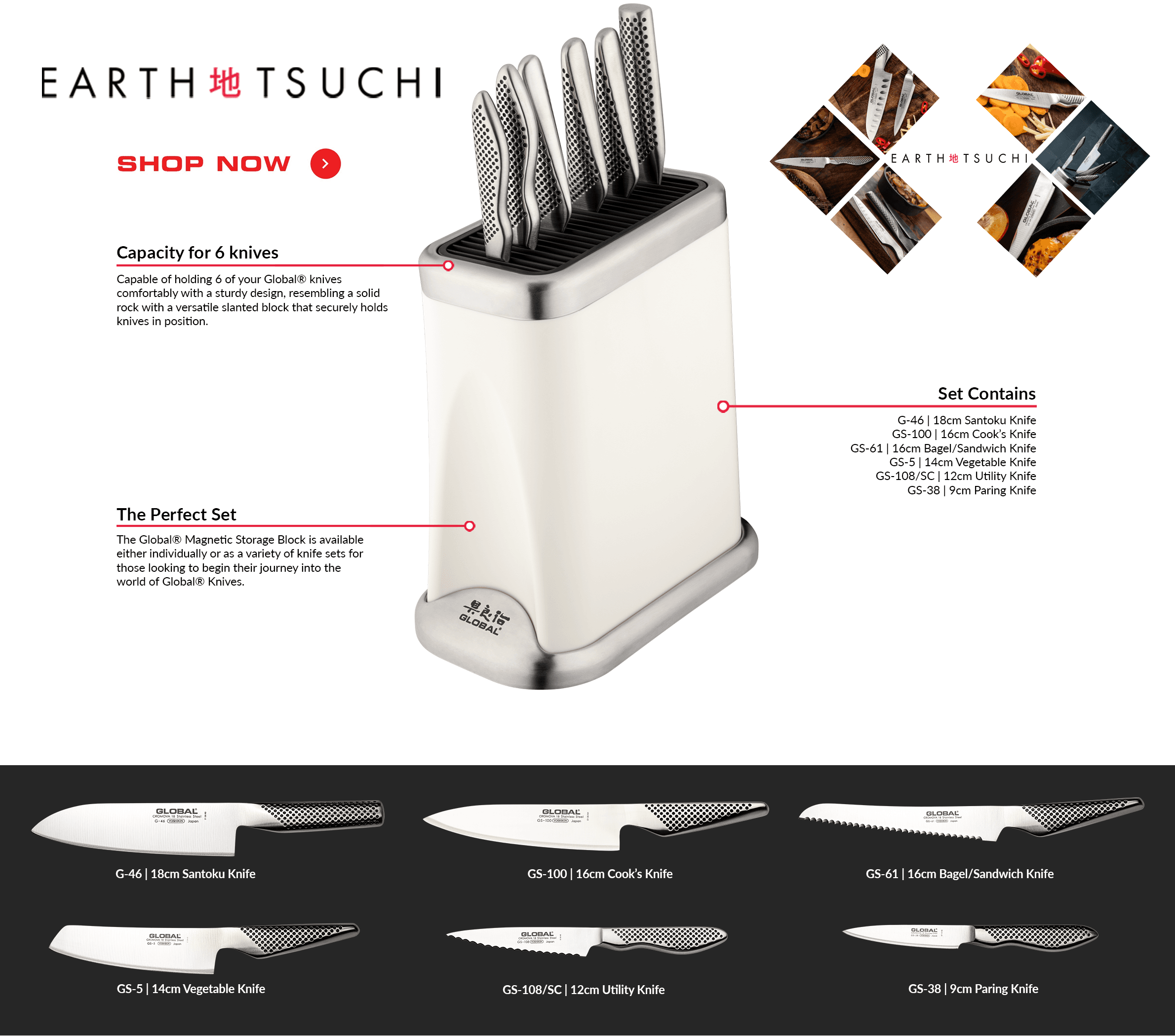 Earth, or "Tsuchi," embodies solidity and stability, symbolized by rocks and stones. Our Global Tsuchi knife sets reflect this firmness with a sturdy, sloping universal block. These sets are inspired by vegetables in cuisine, featuring the versatile G-46 Santoku Knife, an ideal choice for precision vegetable preparation.