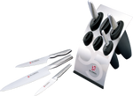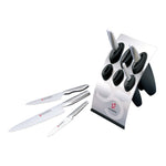 This set comprises a range of high-quality knives essential for any kitchen. It includes an 8cm Peeling Knife, an 11cm Utility Knife, a 13cm Santoku Knife, a 15cm Flexible Utility Knife, a 20cm Cook's Knife, and a 22cm Bread Knife, all housed in a sleek stainless steel block.