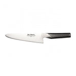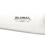 Global's large handle slicer knives come in two sizes, the G-1 at 21cm and this model the G-6 at 18cm, there is also a small handle equivalent, the GS-2. It is listed as a slicing knife, or slicer knife because of its rounded blunt end. It is very similar to the G-2 in that sense but is designed for cutting meat into pieces, the idea behind the blunt end is that the tip does not nick or catch as you are slicing through meat and you can smoothly roll it into the cut. These slicing blades work particularly well on meat that is close to the bone, such as chicken or duck. Nevertheless, the size and shape of the knife lend it to being another all-rounder and this Global knife can be used as a multipurpose knife for cutting up vegetables.