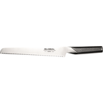 The G-9 is Global's classically shaped bread knife. It is a specialist knife, really for use with bread only. The teeth are made to saw through the crust of bread but could also be used for some tough meats, for example crackling. The funny thing is, the Japanese do not really eat bread and so it is one of those products that they never really understood! If you look closely at the knife blade you will see that on the face of the knife, the teeth have a chamber whilst on the back of the knife, the face is flat. When you cut into bread, you will automatically cut inwards in a curve rather than straight down and the chamber is there to help correct this so that your slicers will be more of a similar thickness all the way through. Whilst the G-9 can be used by left handers, the set up is right handed.