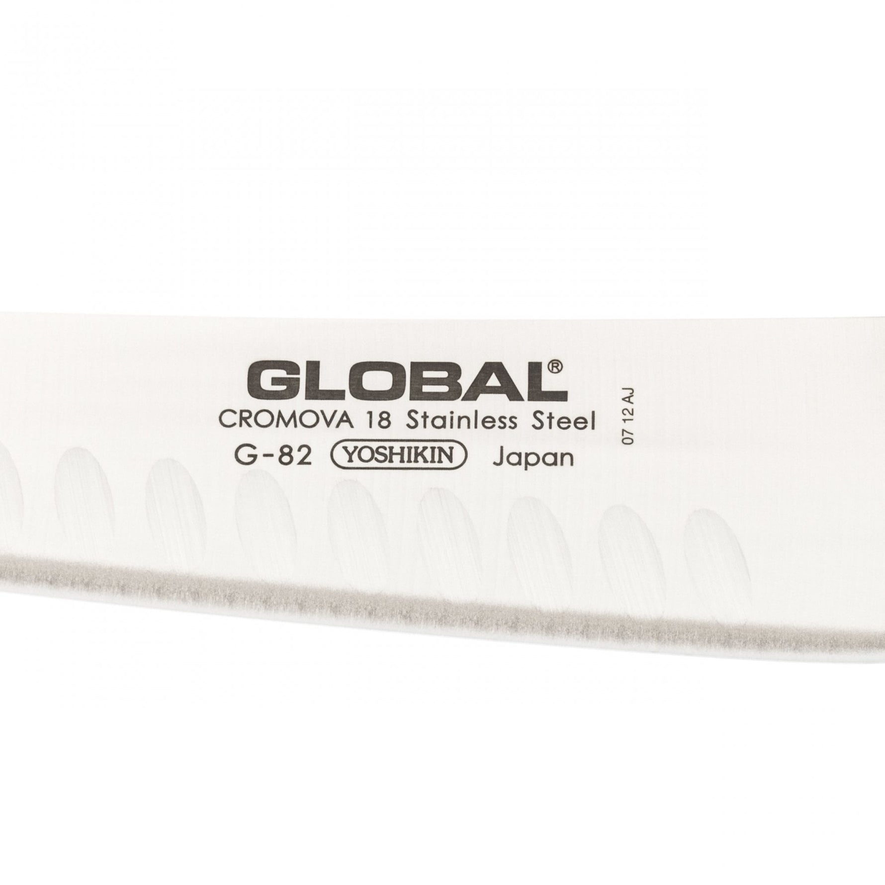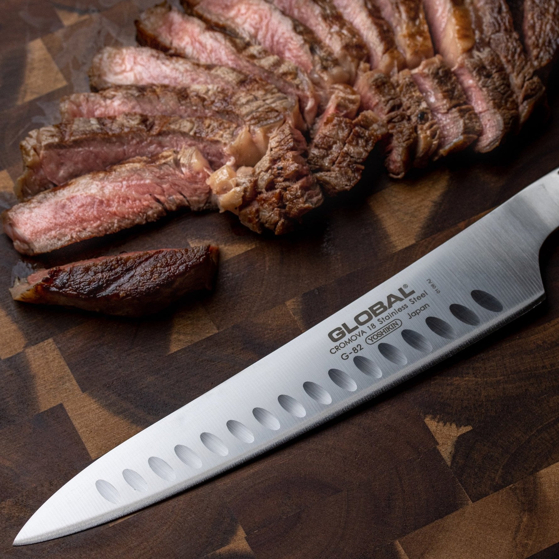 The G-82 is Global’s classic carving knife, long and narrow to carve those perfect Sunday beef joints. There is only one G series carving knife and it is a specialist knife that is not well suited to other tasks, but that should not really matter, because the best cuts of meat demand the best equipment. Having a super sharp Global carving knife will ensure all your cuts of meat are thin and tender. We recommend pairing the G-82 with one of Global carving forks, either the G-13 or the GF-24 to make a matching set. Fluted to prevent food from sticking to the blade.