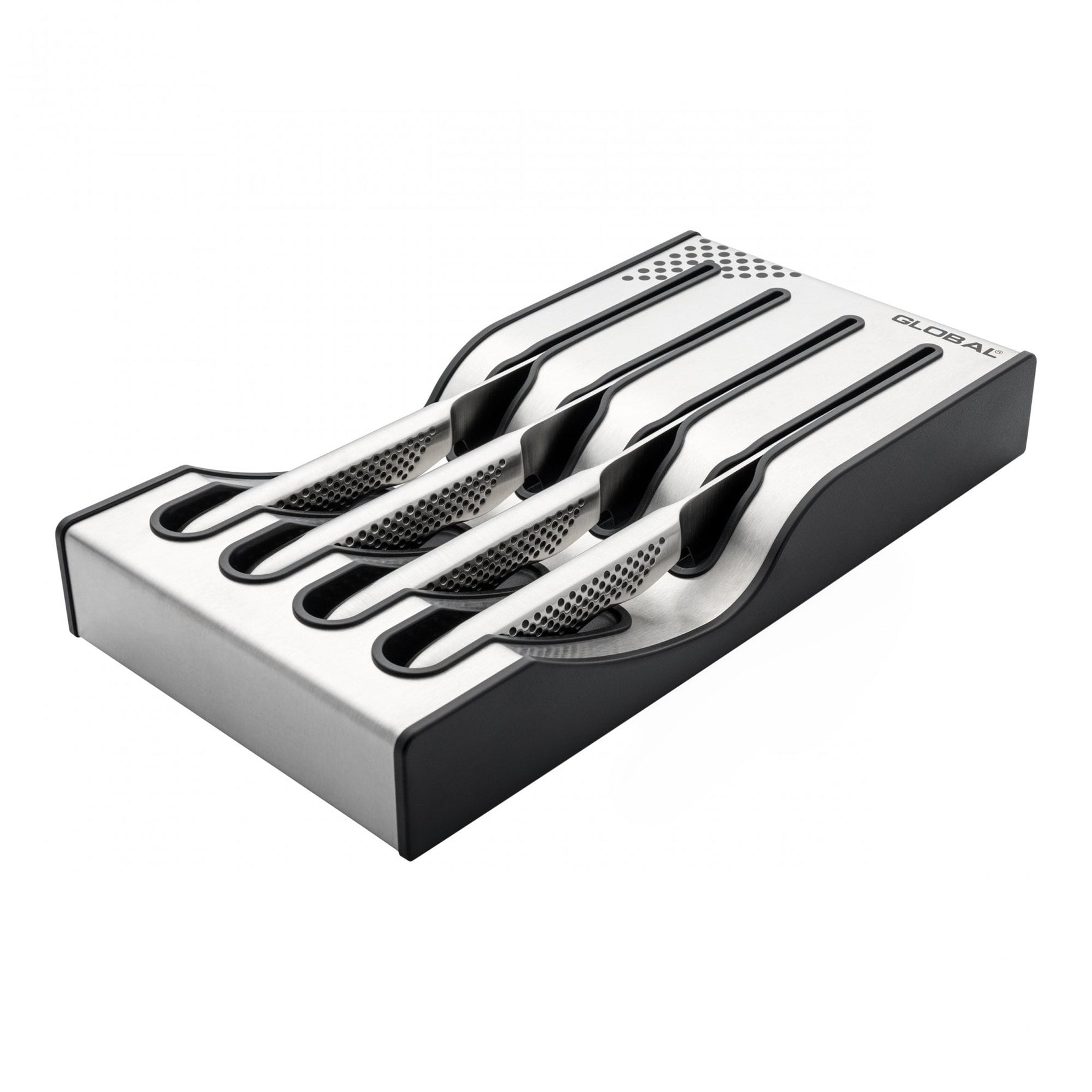 These four Global Steak Knives are presented in a handy in-drawer storage dock to be displayed either on a counter or stored away safely in a drawer.
