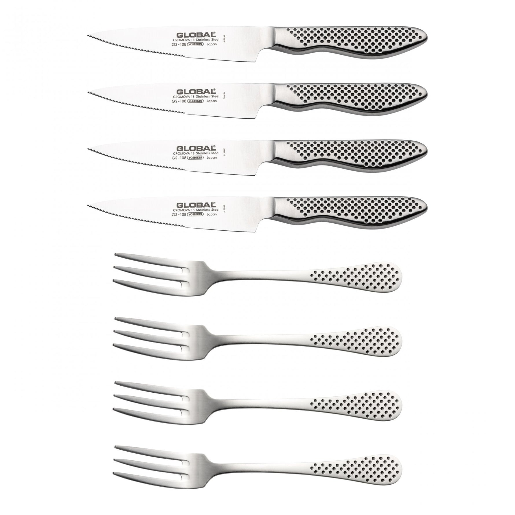 This Global branded steak knife and fork set is the perfect gift for steak lovers. Perfect for entertaining, this set offers 4 place settings. Featuring 4 of the new GS-108B/HS 12cm Half Serrated Steak Knives which form part of The Little Essentials range, they can be used independently as utility knives or to smoothly glide through your steak.