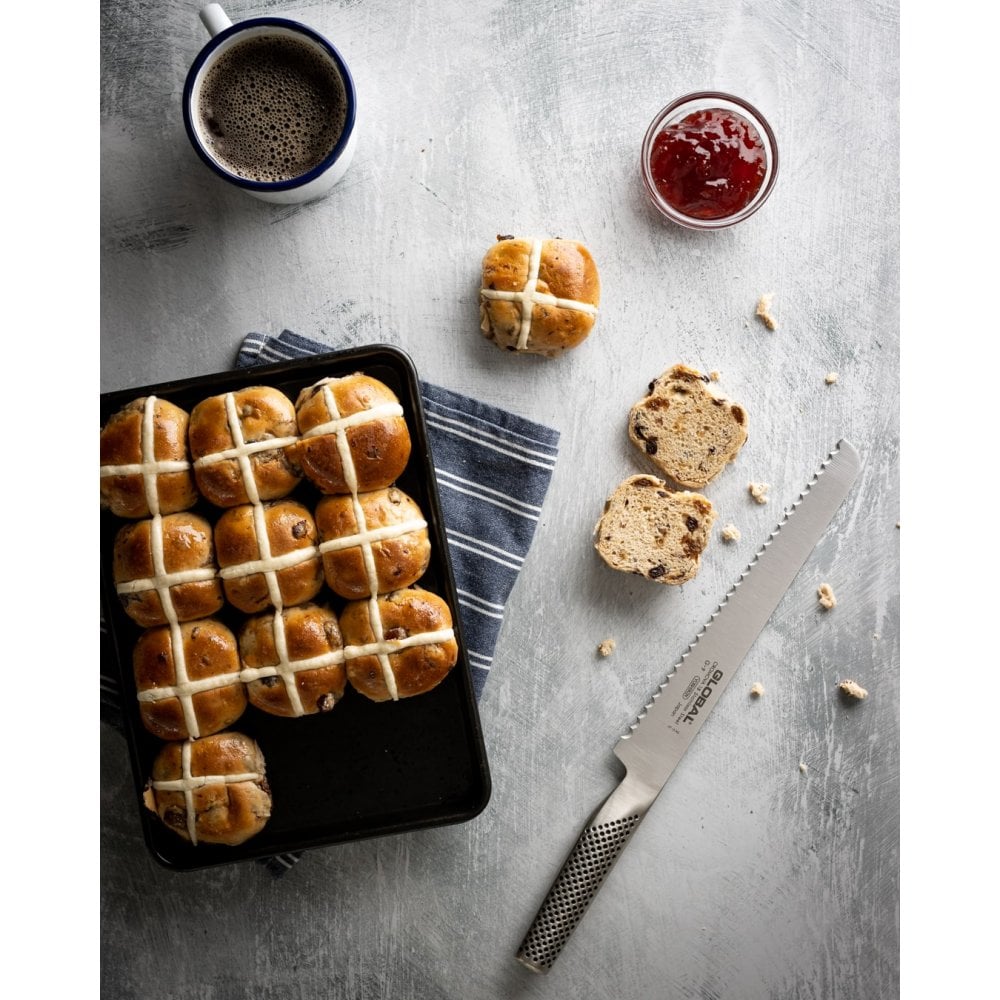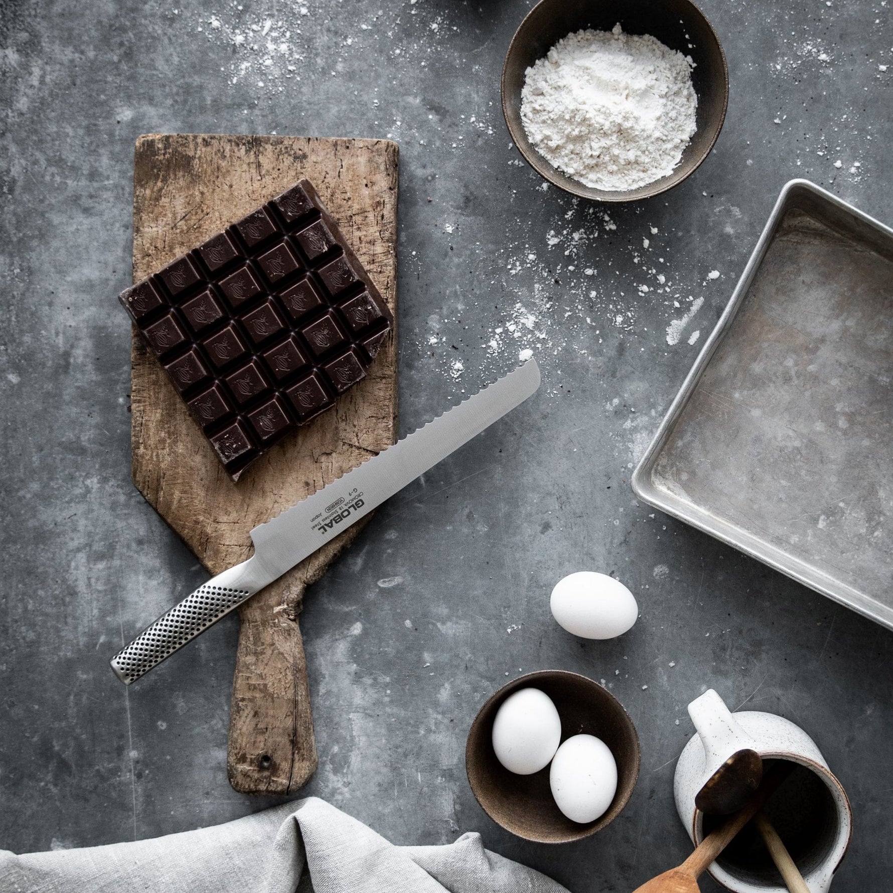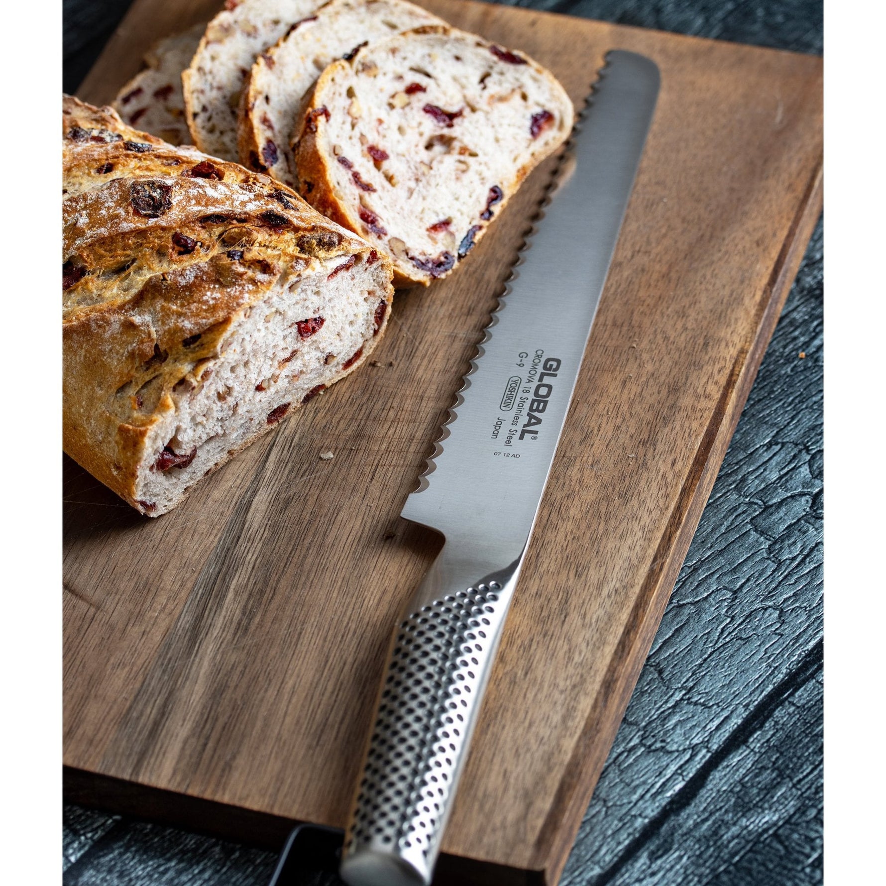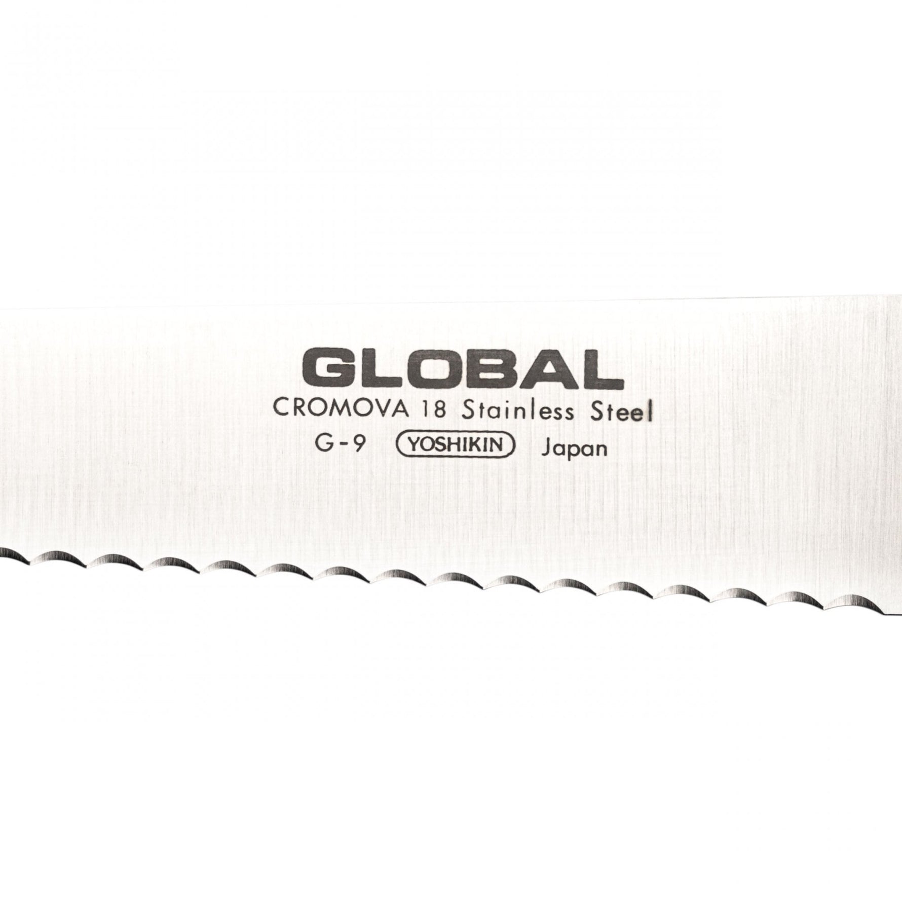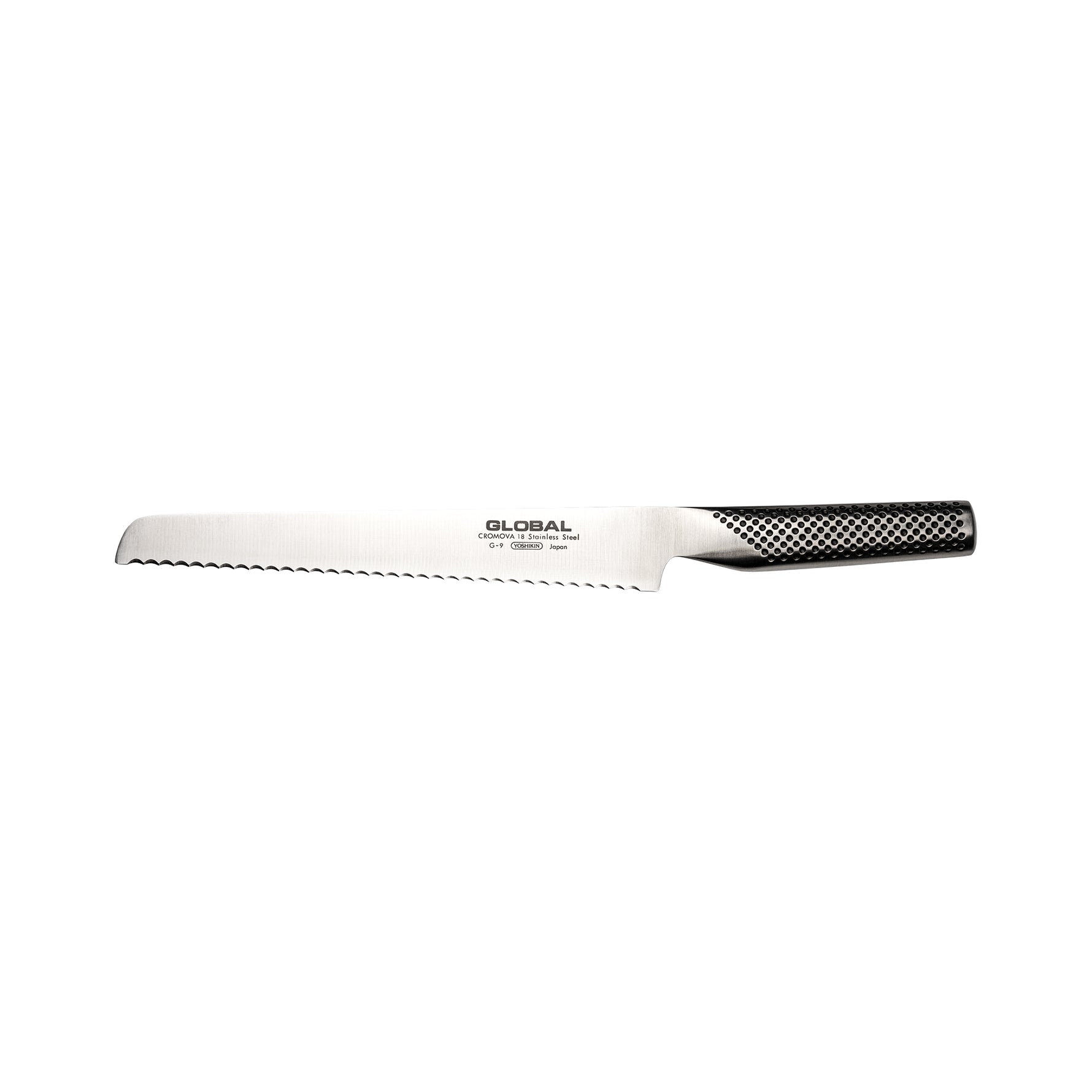The G-9 Bread Knife is Global's classically shaped bread knife. It is a specialist knife, really for use with bread or similar food items only. The teeth are made to saw through the crust of bread but could also be used for some tough meats, for example crackling. The funny thing is, the Japanese do not really eat bread and so it is one of those products that they never really understood!