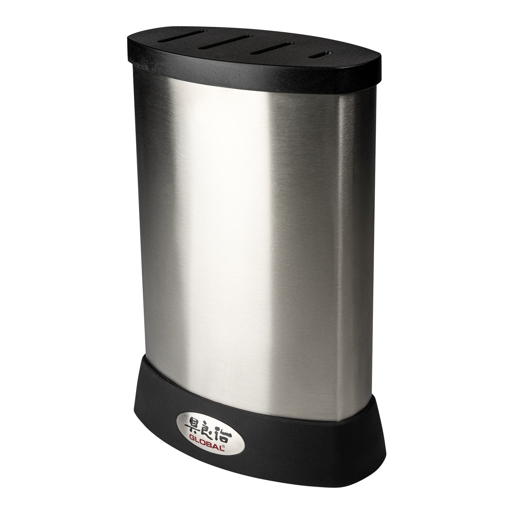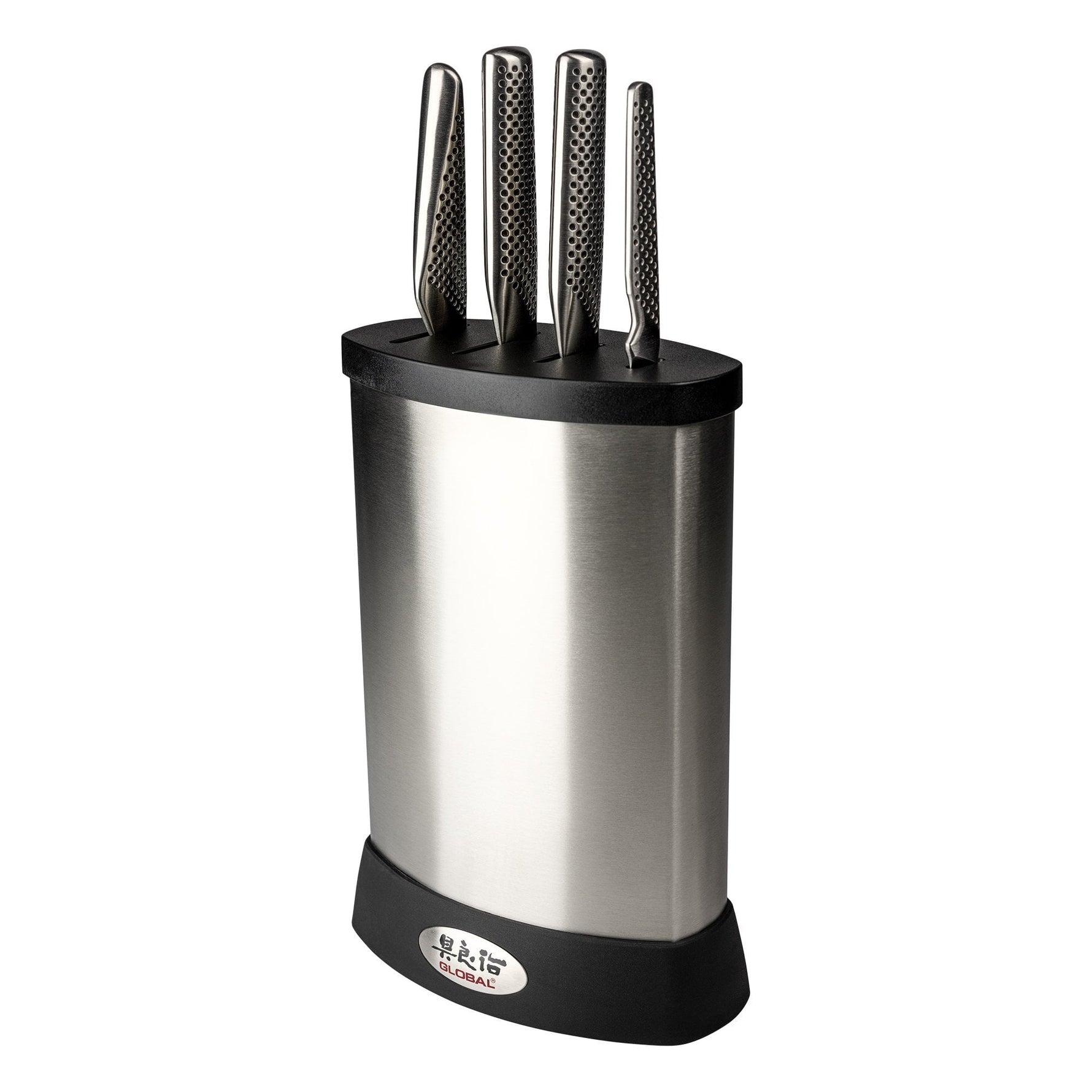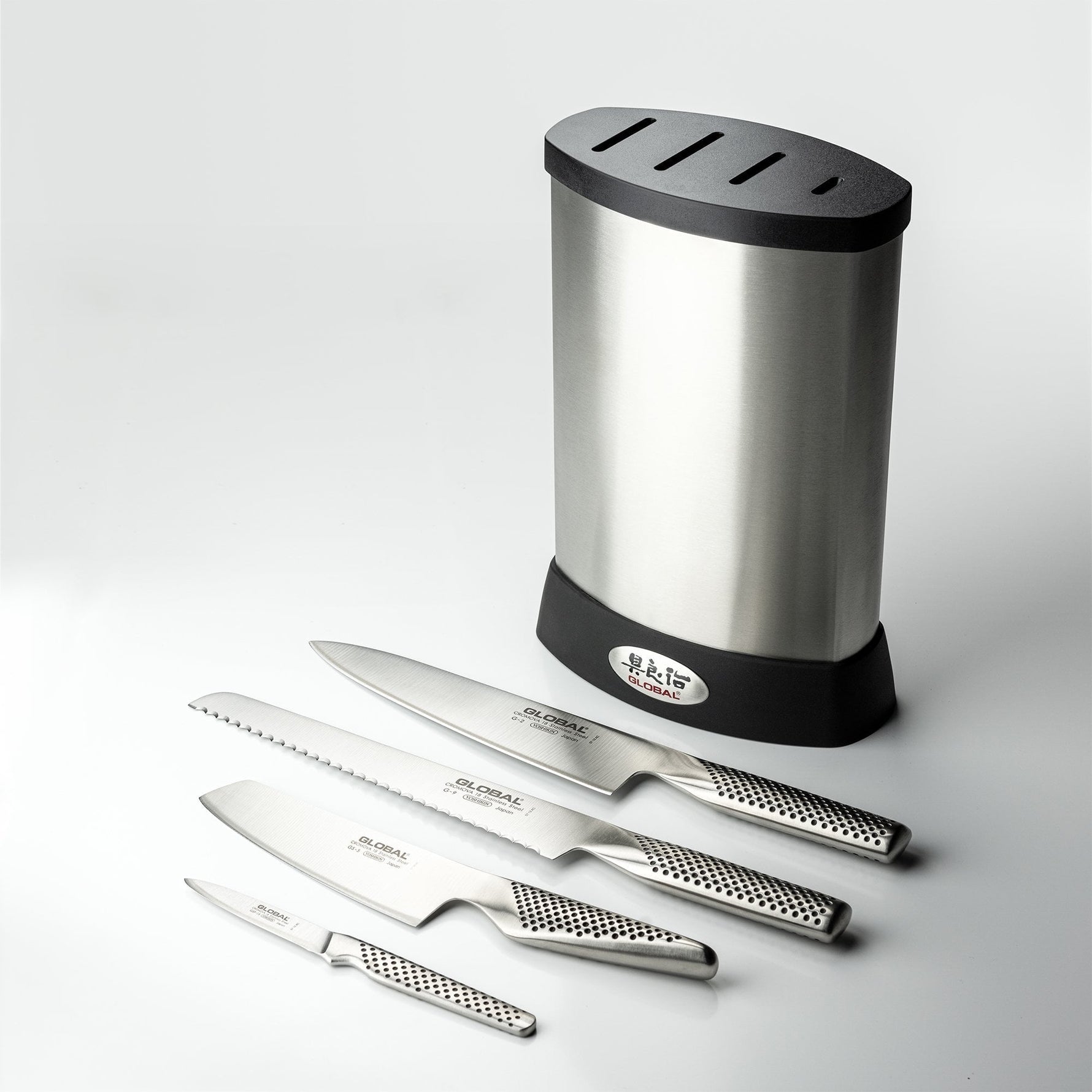 This is a limited edition global knife block set which you will not find anywhere else. We have managed to secure only 20 of these for Black Friday so once they are gone we will not get anymore. The set contains 4 knives which is everything you need for use at home or as an amateur cook. In the set you get a 20cm G-2 which is a chef's knife that is not too big and is a great all rounder. Then you have a 22cm G-9 bread knife which makes cutting through sour dough or baguettes an absolute breeze. It is then followed by a 14cm GS-5 which is a small vegetable chopper and is used mostly for cutting up small vegetables for sandwiches or for a salad and the set is then finished off with a 8cm GSF-15 that is a fully forged global knife meaning that it is much stronger and can be used to separate meat joints while also being great at smaller tasks like peeling and cutting fruit.