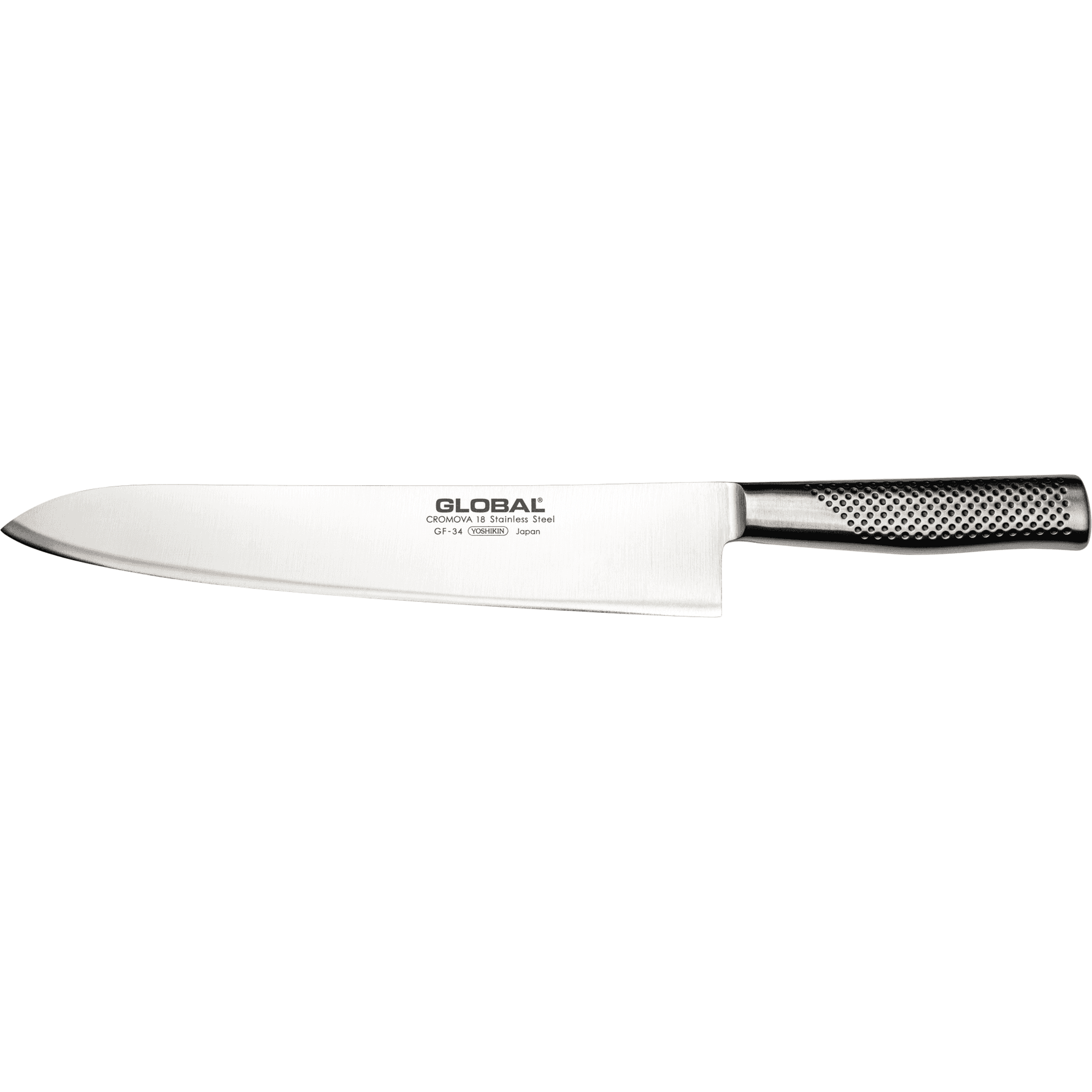 This chef's knife can be used for any purpose. It is a really good tough medium-sized chef's knife capable of performing a variety of kitchen tasks. It is built in the shape of Gyuto, a Japanese style knife, these knives generally have a flat part of the blade towards the heel for chopping, whilst the front half of the blade is curved for slicing and more precision work. The knife has a slightly kicked forward heel to it which provides a semi bolster for a bit of added protection. As a fully forged knife, it is stronger than the standard G series of knives and lends itself well for use in professional kitchen settings. A great knife if you are looking for one knife for all tasks. If however, you want something a little smaller, consider the GF-32 or GF-33.