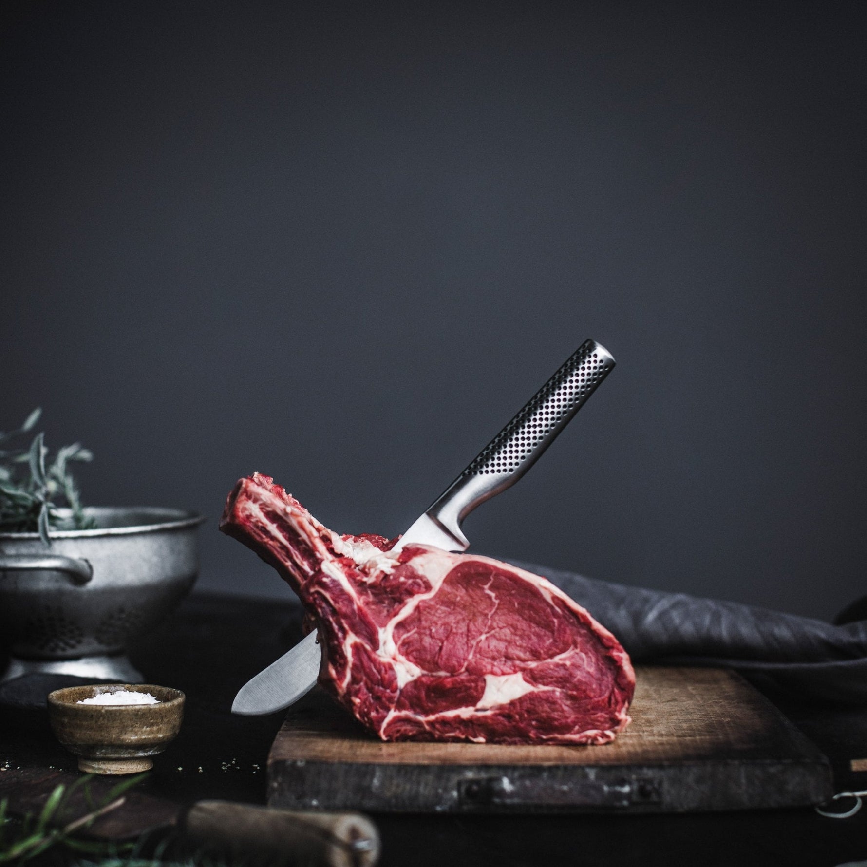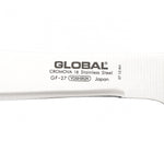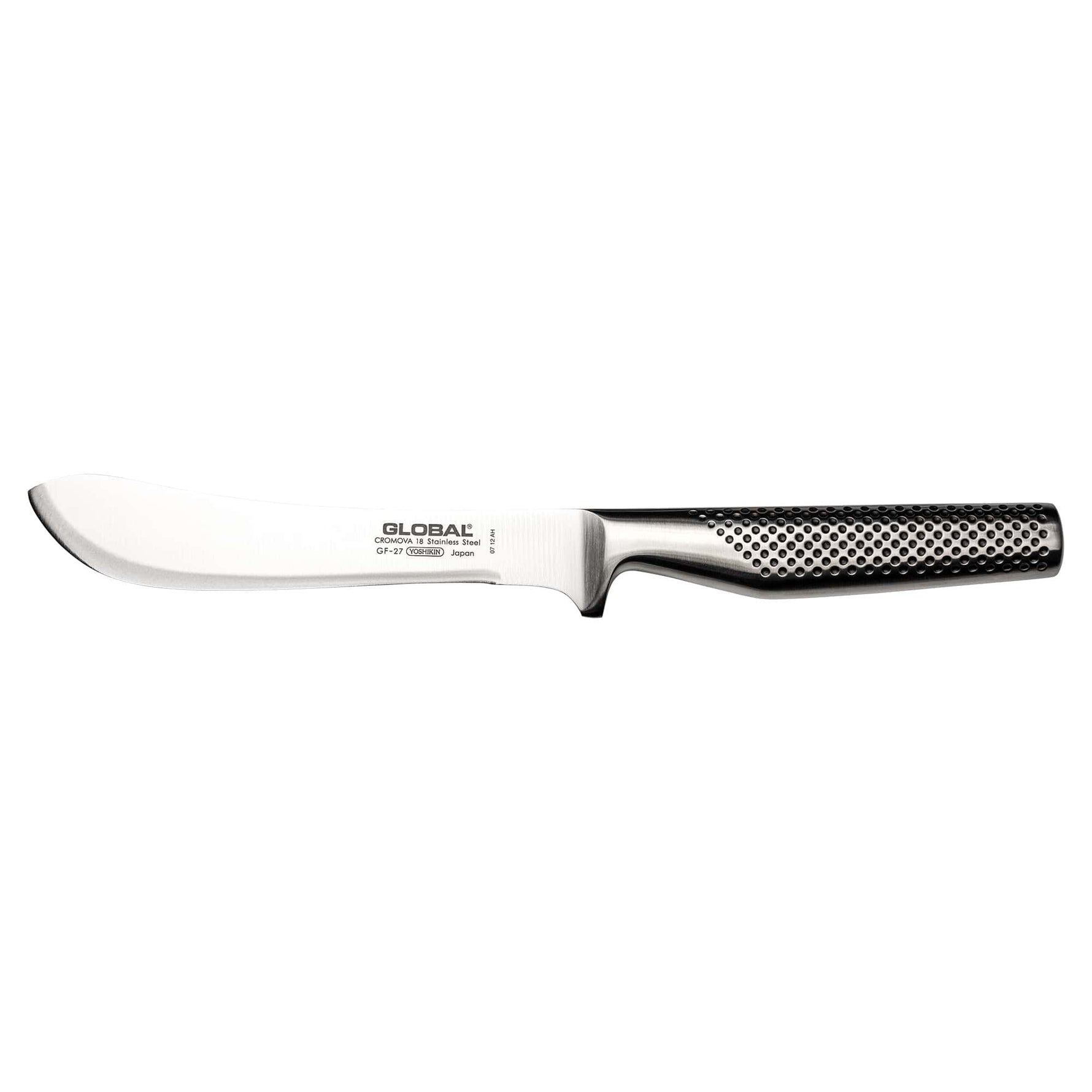 The GF-27 is a specialist knife blade for butchering raw meat. The curved thin blade is designed to slice through joints in raw carcasses. The shape of the knife with its right angle curve in the blade is made to slash across flesh and so separate the meat from bones, ligaments and other parts that are not wanted. It is a specialist knife and does not work well for cutting or chopping vegetables and other regular kitchen work. The GF-27 has a bolster, which gives it an edge over the bolster-less G-28. This is particularly useful when the slime from raw meat can make the knife handle slipped, just having the bolster there gives you a little more drip, control and confidence when using the knife.