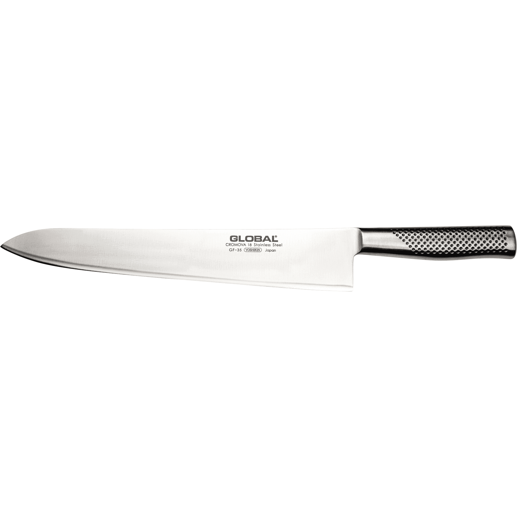 The Global GF-33, GF-34 and GF-35 are Global's fully forged chef's knives. As chef's knives they can perform any kitchen task. They can slice dice and chop and are generally all round multi-purpose knives. The GF series of chefs knives come in three sizes, a GF 33 is 21cm, GF 34 27cm and GF 35 30cm and the vegetable chopper GF 36 is 20cm