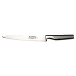 The GF-37 is Global's fully forged carving knife. It features a long 22cm blade, which can easily slice through the best cuts of meat. the addition of a bolster gives a bit of extra protection. With a long narrow blade the knife can also be used for filleting fish, slicing fish or preparing sashimi. It makes a poor chopping knife, because the blade is in line with the bottom of the bolster, meaning the knife can only really be used for slicing by drawing the knife backwards.