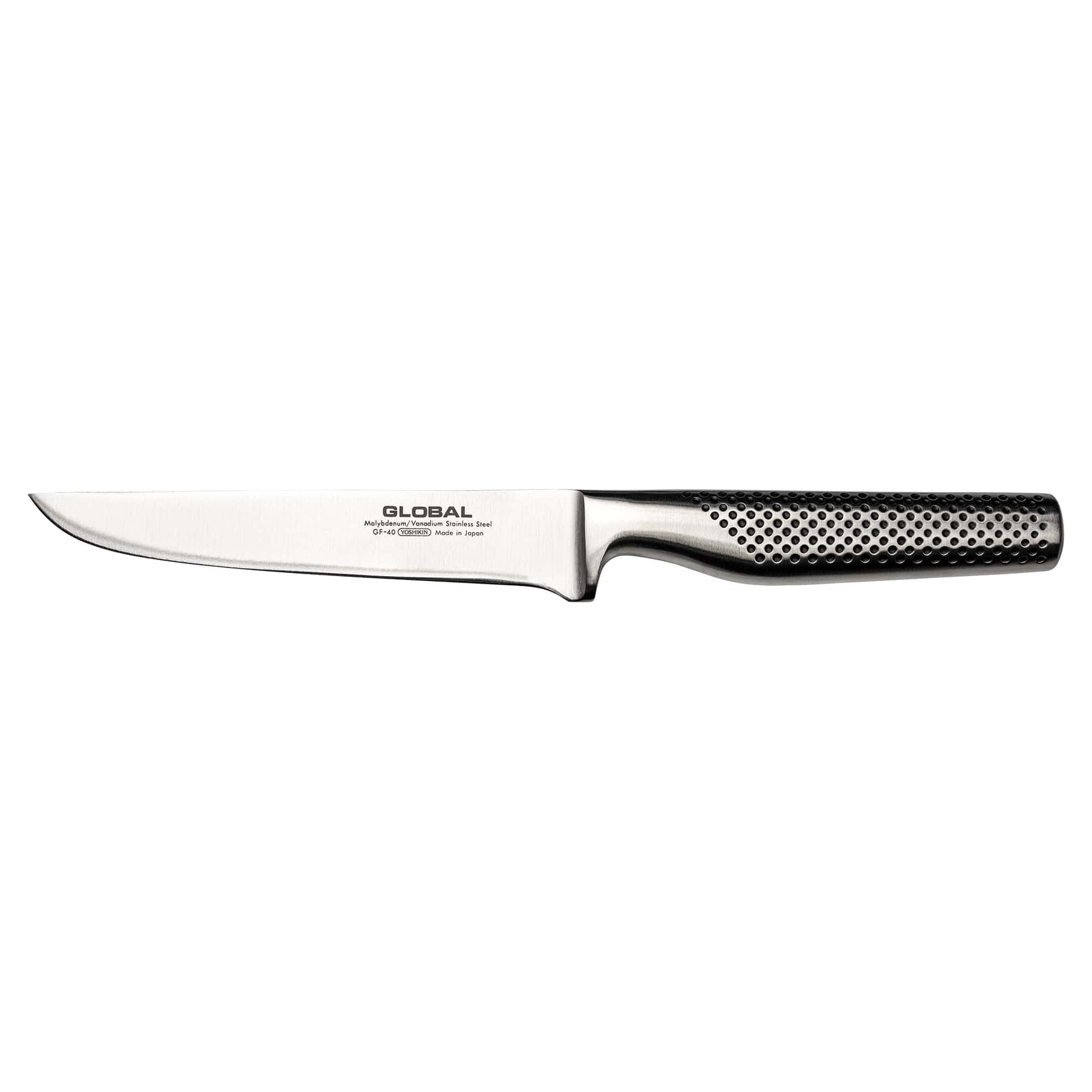 The GF-40 is listed as a boning knife, but the profile of the blade makes it suitable for a variety of kitchen tasks because of the small hilt and elongated upturn in the blade. Being fully forged it is strong enough for most kitchen tasks and can be equally used as a universal knife. This knife can be used as a small slicer, a boning knife or for cutting up small bits of meat, fruit or vegetables. It has a nice big comfortable handle with a bolster for extra protection. The protection of the bolster makes the knife suitable for cutting raw meat as it gives you a bit more grip on the handle.