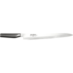 A Yanagi is a specialist Japanese knife for slicing pieces of fish for sushi and sashimi. The long blade is to allow the chef to make long broad strokes to make sure that the cut is made in one go. Global's Yanagi Sashimi slicers are ground in typical Japanese fashion with a single bevel on the face of the knife. The single bevel is to allow professional chefs more control to control the thickness of the sashimi slices and make sure the cut is perfect for presentation.