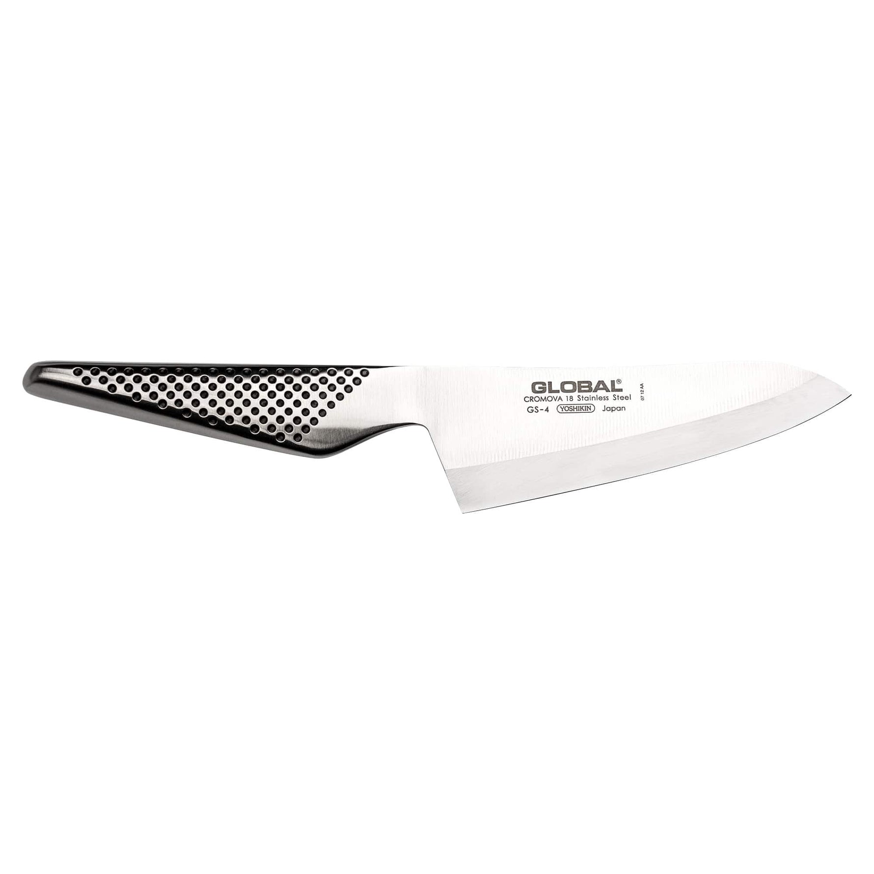 The GS-4 is Global's small version of the Deba Bocho knife, a small version of the G-7 Deba, a Japanese style kitchen knife used to cut mostly fish but also meat. This knife has the traditional Japanese one sided grind so is not suitable for Western style preparation. It can be used for cutting, filleting and slicing smaller fish. A perfect small utility knife for Japanese chefs who use a larger Sashimi or Deba knife and need something for lighter work.