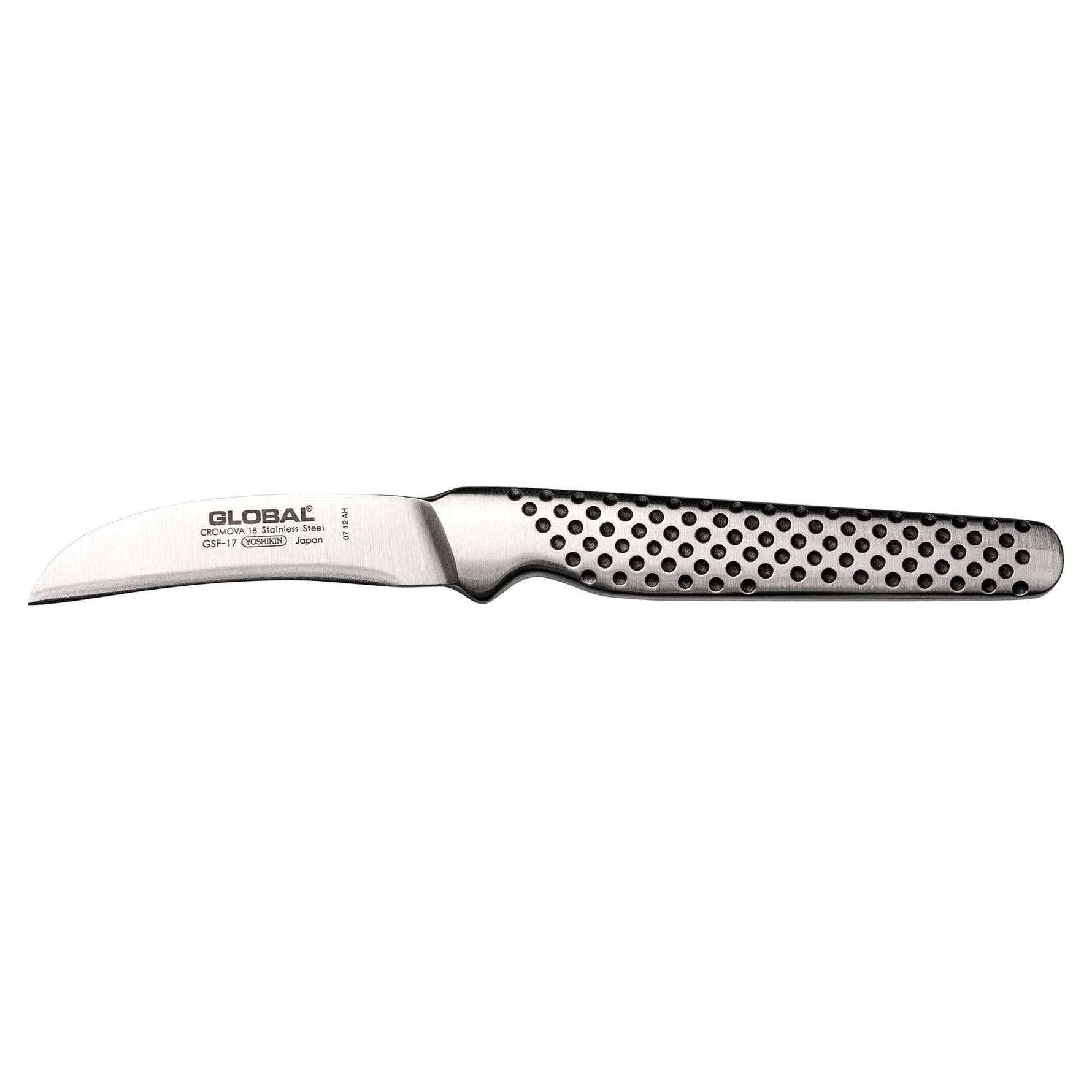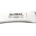 The GSF-17 is Global's main small peeling knife. It is a knife with a very specific purpose; to peel and turn as many vegetables as you can get your hands on! The small curved blade makes the knife practical for working around spherical objects like potatoes and apples. There is a small notch in the handle to provide grip and control to work around bumps and grooves, the sharp blade will work through tough skin on sweet potato and other root vegetables.