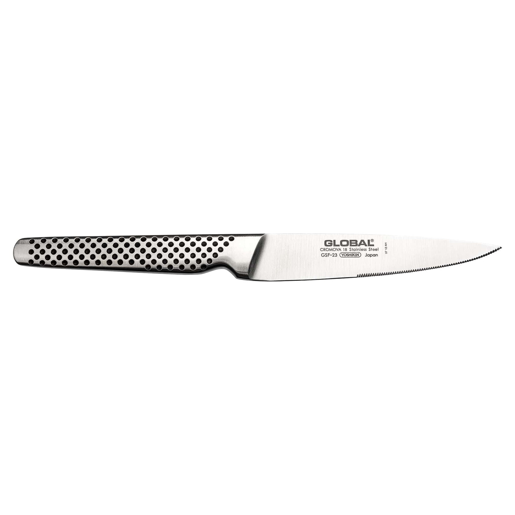 The GSF-23 is one of a few steak knives made by Global and is great for use in tucking into big juicy fatty Rib eyes and Sirloins. It will saw effortlessly through fatty pieces of meat to give you nice clean cuts. In fact this knife has more in common with the other GSF utility knives than other steak knives as the main feature of the blade is the subtle serration in the blade. This makes the knife ideal for steaks but also works well as a utility knife for softer fruits and vegetables. It would make a great tomato knife, so is a multi function blade.