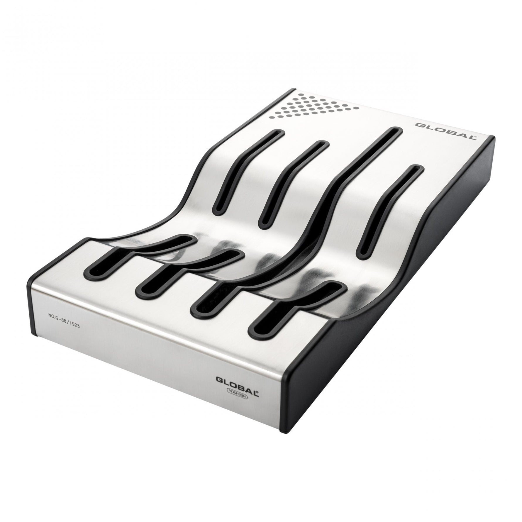 The stainless steel knife dock ensures these Global knives are always close to hand and protects you and the knives when stored in a drawer.