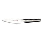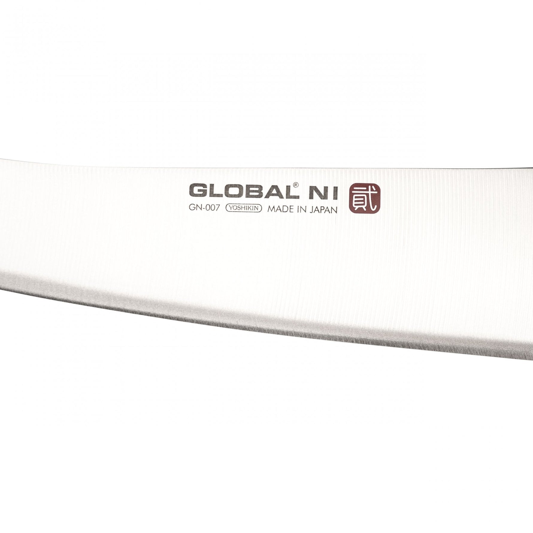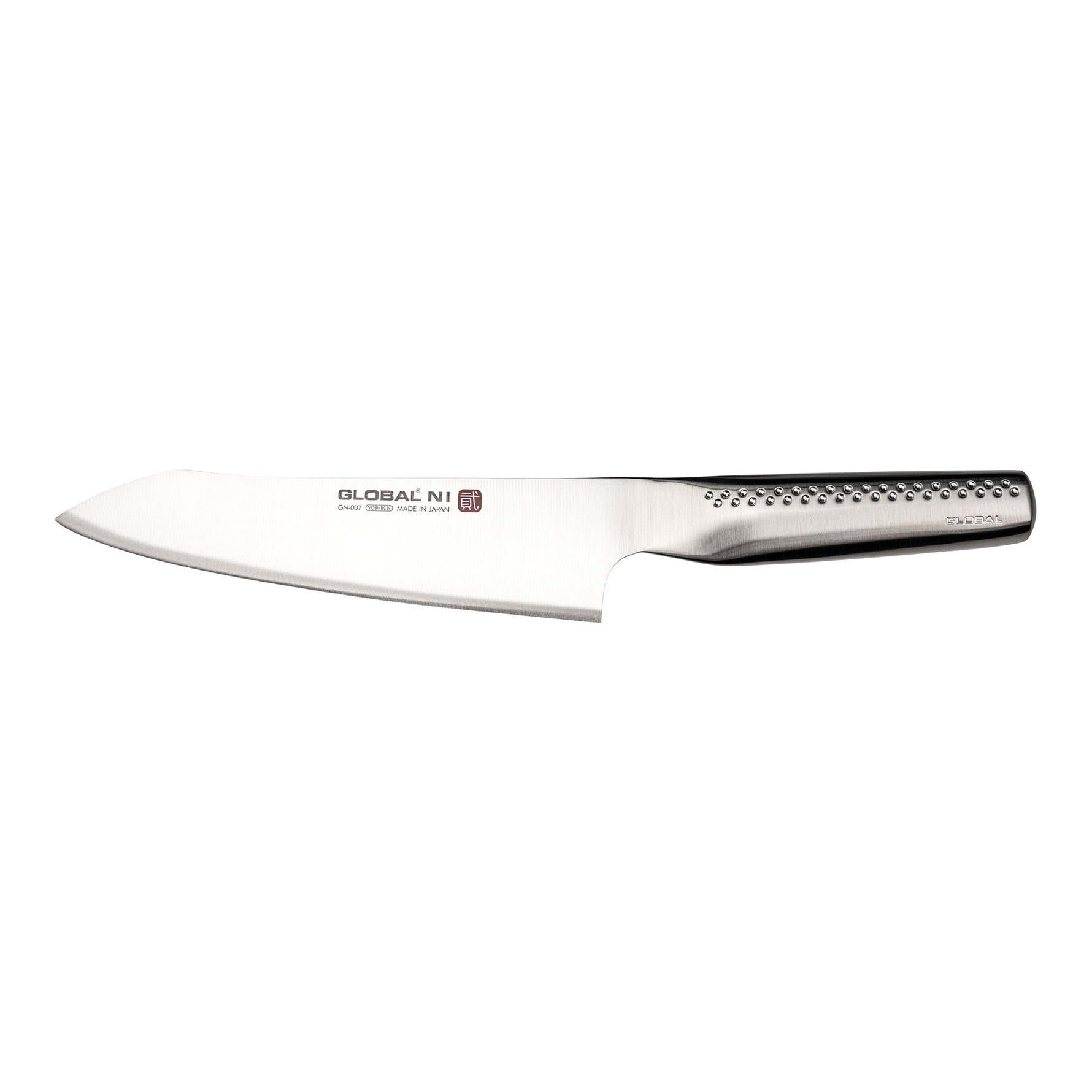 One of the problems of the Global Ni series is that the cook's knife is sort of a hybrid between a classically shaped cook's, santoku and vegetable knife, so when we say this knife is the Global Ni santoku knife it looks very similar to the cook's knives. The only slight difference is that this knife has a deeper blade and it is slightly flatter making it better at chopping rather than slicing. The Global Ni Santokus come in 3 different sizes, a middle size, the GNM-05 and a mini 11cm the GNS-03.