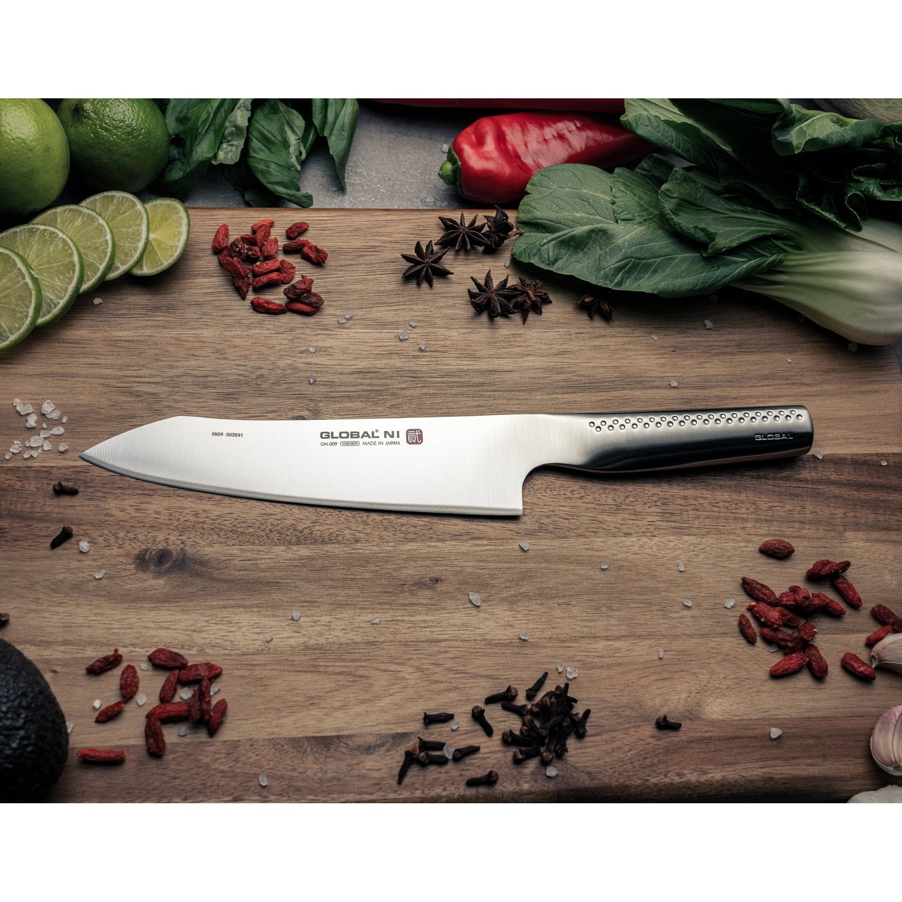 There are 3 different sizes of Global Ni cook's knives. The GN-009 is the most popular size with a good 20cm blade. It is the Global Ni equivelent to the best selling and award winning Global Classic G-2. If you are looking for one good knife, or one knife to start off your Global Ni collection, the GN-009 is probably where you should start. As cook's knives, they can be used for most kitchen tasks, slicing, chopping and cutting and are the 'go to' knives in the Global Ni range. The Global Ni cook's knife additionally comes in a 16cm size as the GN-008 and 26cm as the GN-010. The two smaller sizes also come in fluted versions as the GN-001 and GN-002.