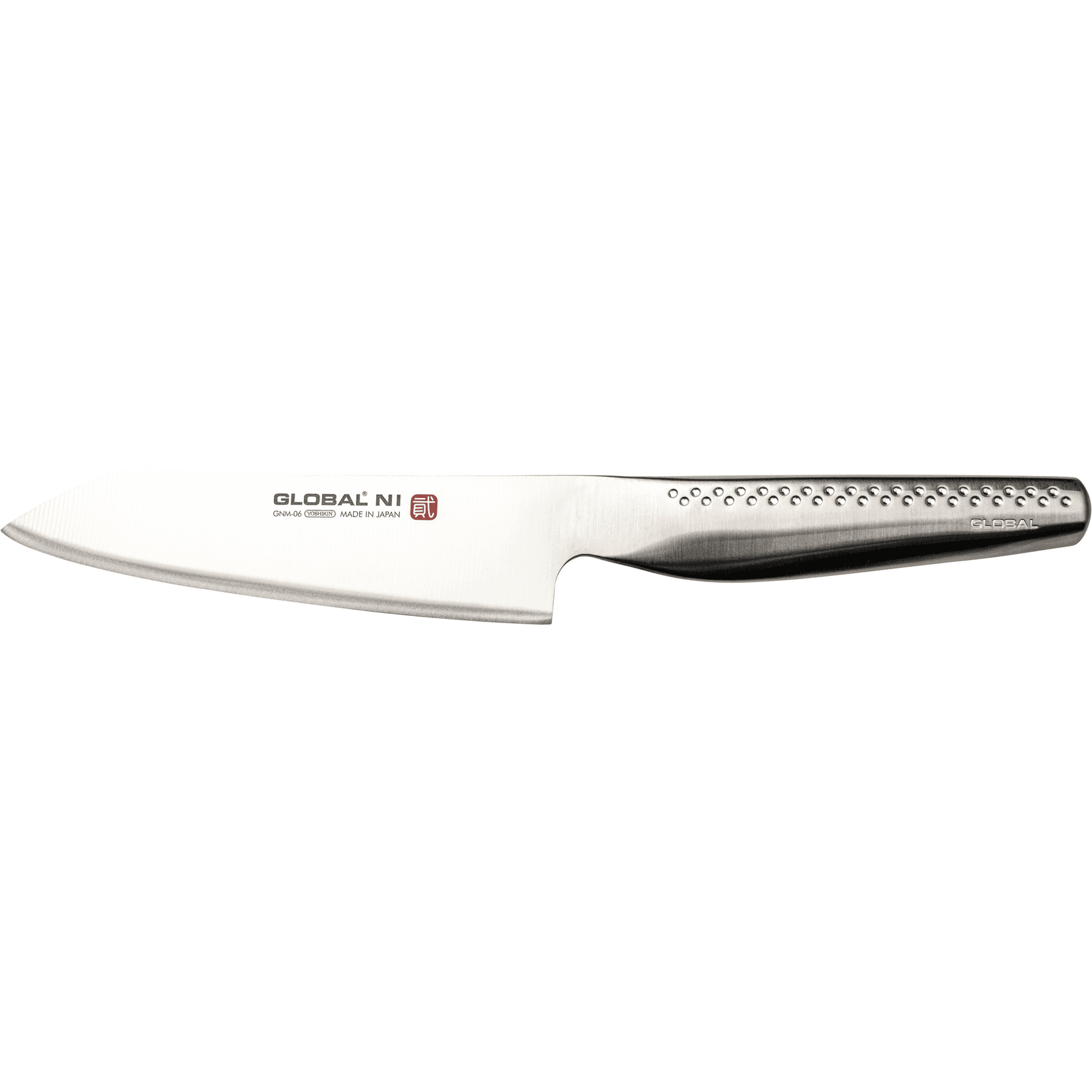 Global Ni produce 3 different sizes of vegetable knife. These knives all feature flatter blades designed to cut down through vegetables and give clean cuts. Choose between a GNM 08 - 16cm, GNM 07 - 15cm and GNM 06 - 14cm size. These knives are based on the popular G-5 and GS-5 Global classic vegetable choppers. These knives are more or less identical in shape to the cook's and santoku knives, so do consider these as alternatives. There is also a 14cm fluted vegetable chopper available in a 14cm size, the GNM-01.