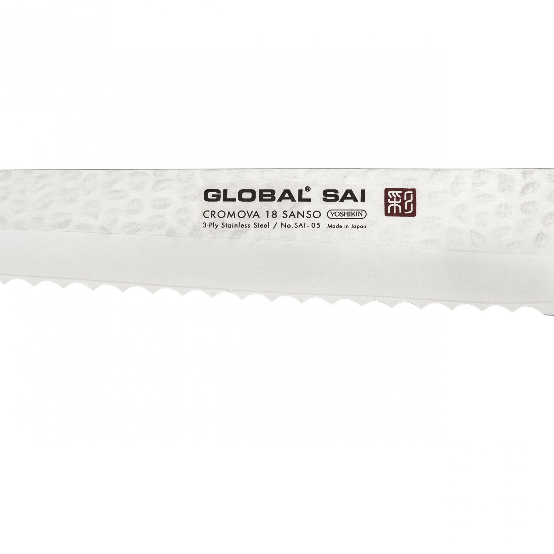 Global SAI's bread knives are designed to cut through the crustiest loaves of bread, This bread knife is quite long and does not fit in the medium and small size Global blocks. If you are looking to add a bread knife to a block set, try the SAI-M04 which has only a 17cm blade.