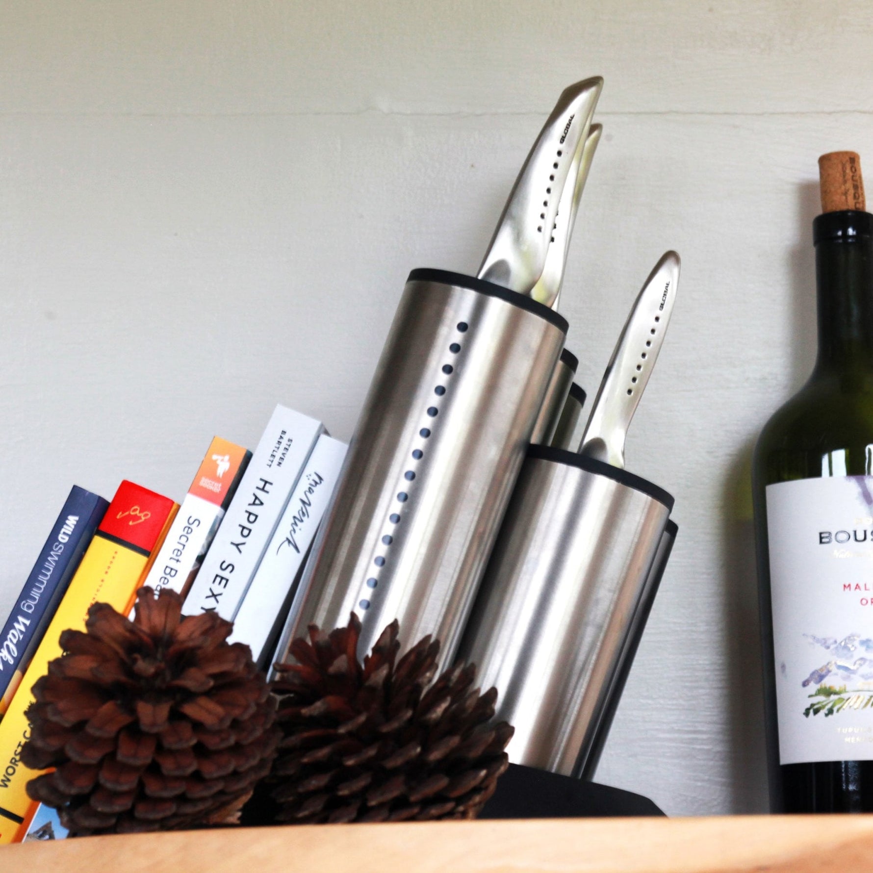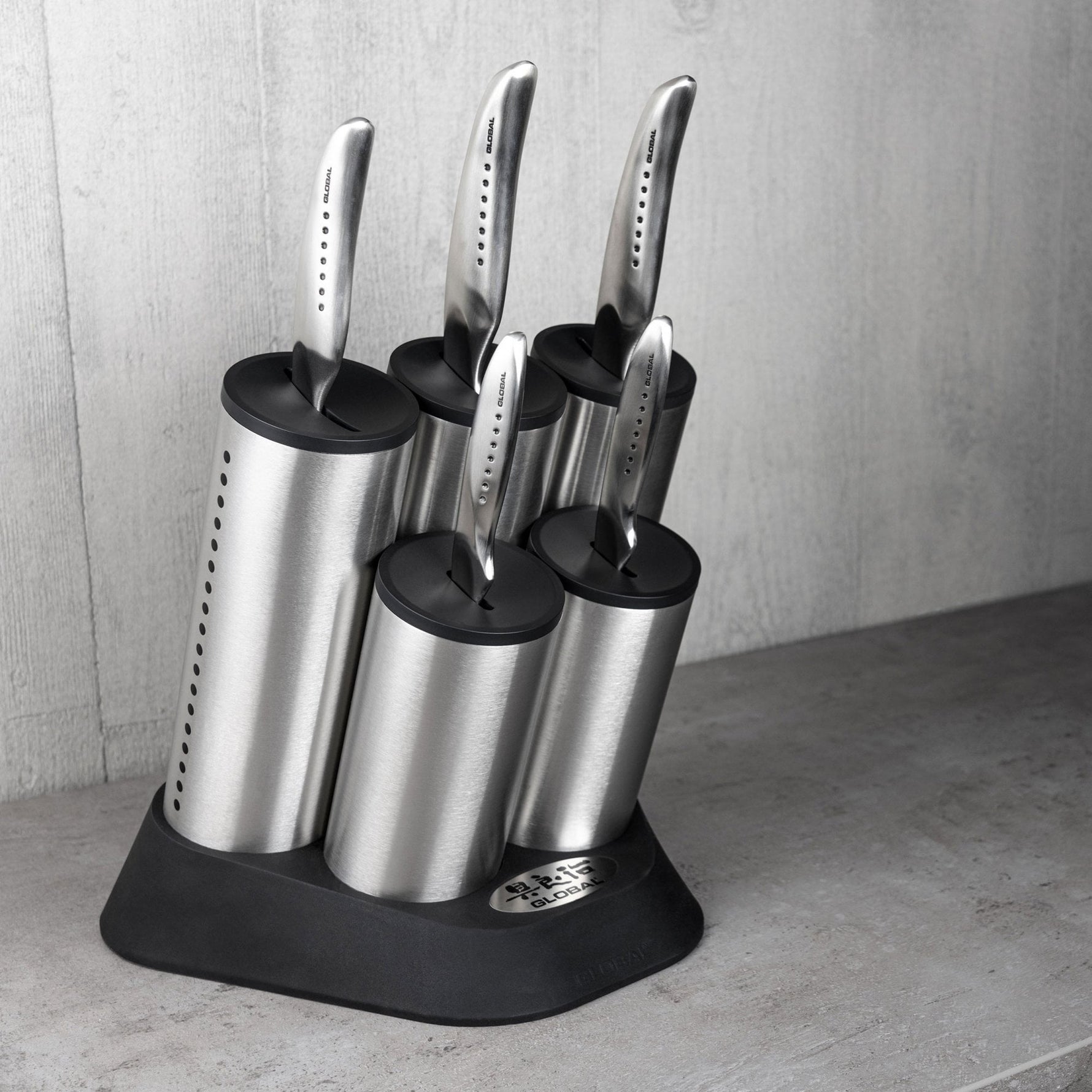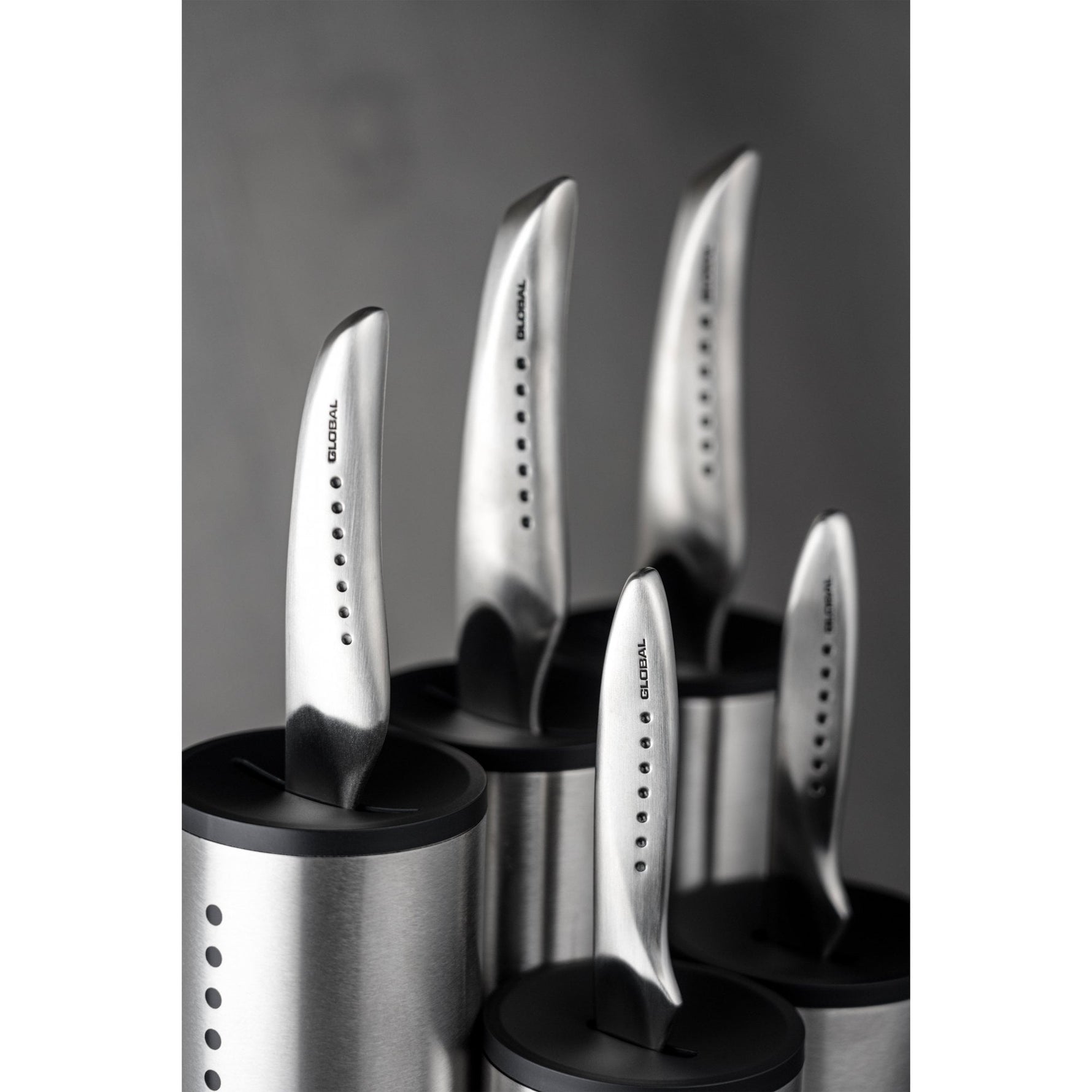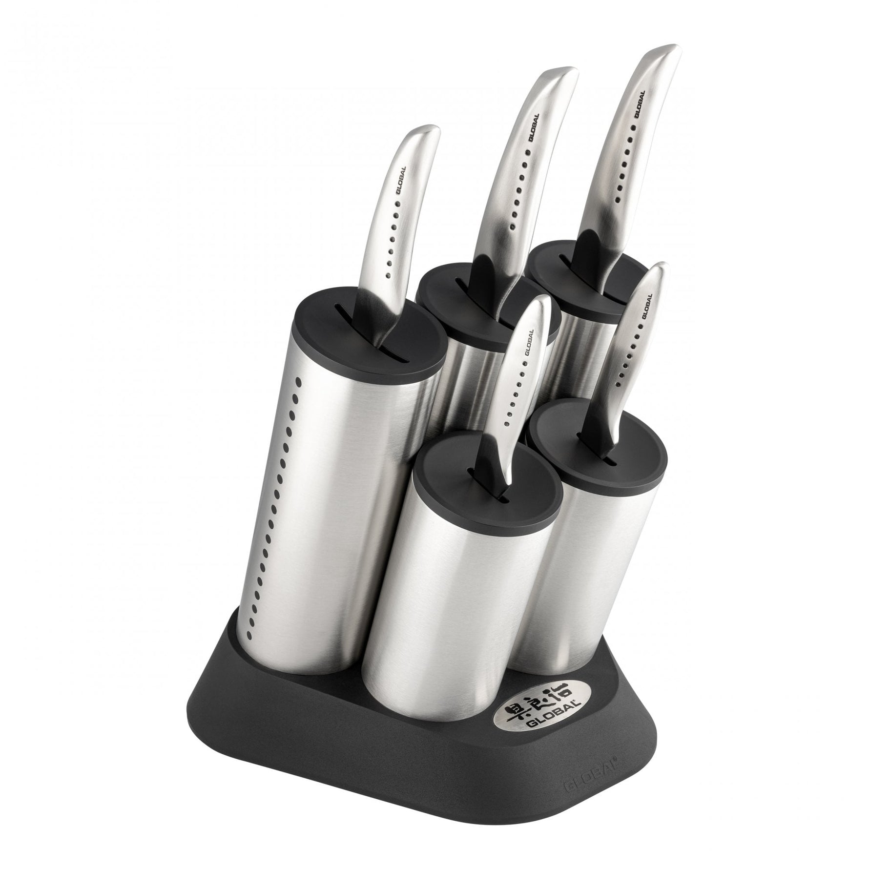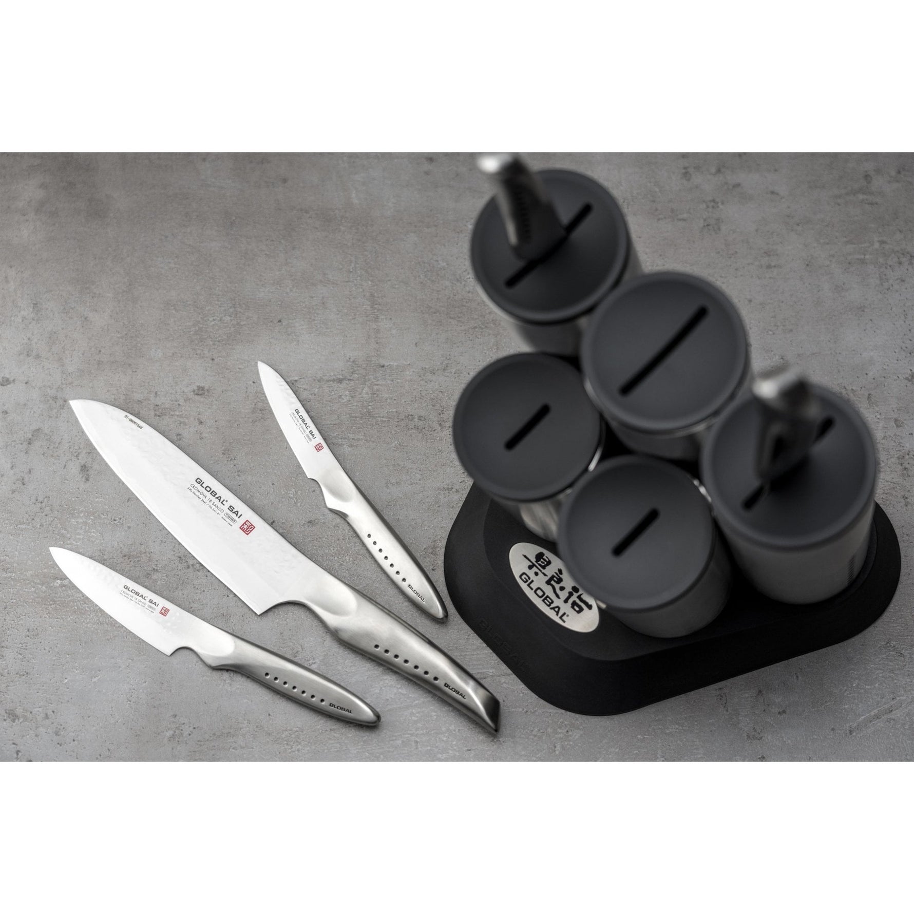 The ‘Team SAI’ knife block features 5 stainless steel cylinders made from the finest 18/10 material. This premium set includes an SAI-01 Chef’s knife, SAI-05 Bread knife, SAI-M06 Vegetable knife, SAI-S02 Utility knife and SAI-S01 Paring knife.
