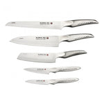The SAI-01 is the leading knife in the Global SAI range. As the 19cm Chef's knife it can perform any kitchen task and is the perfect all-round knife for mincing, dicing, chopping and slicing. The handle design incorporates an ergonomic thumb rest which helps set the right grip for the best cutting technique. The second piece in the set is the Global SAI-05 23cm Bread knife which is designed to cut through the crustiest loaves of bread, it has a serrated edge that can also be used to slice through fruit and soft vegetables. Next is the Global SAI-M06 15cm which is a specialist Vegetable chopping knife. It has a long flat blade designed to get a clean cut when the knife cuts down onto the board. It is quite a heavy knife and suitable for long hours in the kitchen. The next piece in the set is the Global SAI-S02, which is a good all-around knife and has a good mid-sized blade length at 10cm which is suitable for a range of tasks. The shape of the blade suggests that knife can be used for slicing and so would make a good small carving knife especially if you like eating chicken or duck. It is also the knife closest to being a filleting knife in the range. The Global SAI-S01 9cm paring knife is the final piece of the set. The knife is made for small kitchen tasks, such as peeling vegetables or cutting up fruit, a general all-round knife for small and repetitive tasks.