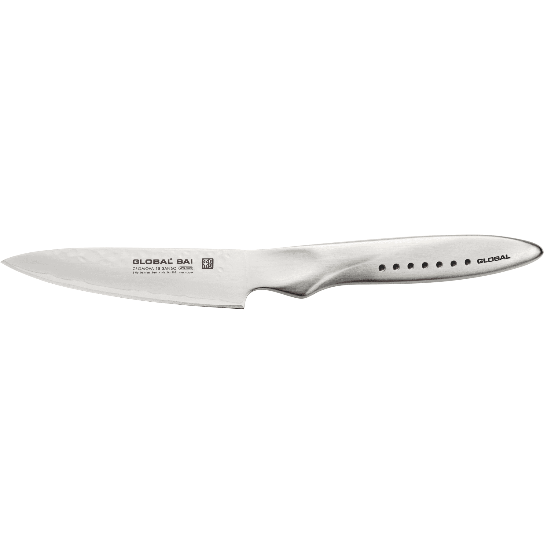 The SAI-S01 9cm & SAI-S02 10cm are small paring knives that can be compared to the GS-36 in the classic Global line. The knife is made for small kitchen tasks, such as peeling vegetables or cutting up fruit. Global SAI produce two 9cm paring knives, the other being the SAI-F01. The difference here is that the S01 has a longer hollow handle. This makes the knife a bit more comfortable in the hand, but the handle with the thumb rest forces you to hold the knife in a certain way and we would suggest that makes this paring knife a better cutting and slicing knife than the F01.