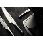 In true GLOBAL tradition, the knife is constructed from the best Stainless Steel material and the UKON series features thicker blades to enhance performance. UKON knives are subject to even more precise grinding and finishing work, making them 10 percent sharper out of the box. The knives are designed with an ambidextrous thumb rest that sits closer to the blade for added control and efficiency. The underside of the handle features GLOBAL's trademark indentations, making UKON knives extremely comfortable to hold.