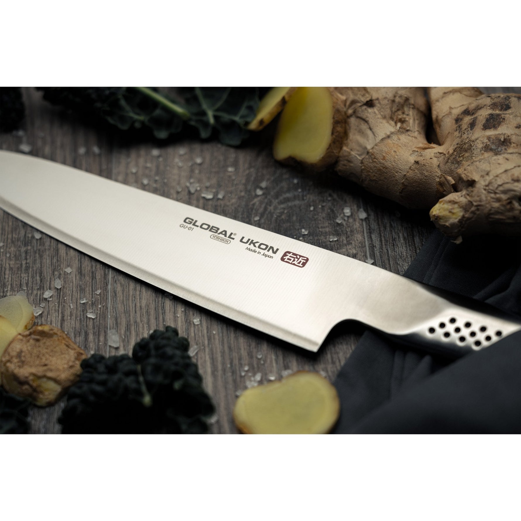 In true GLOBAL tradition, the knife is constructed from the best Stainless Steel material and the UKON series features thicker blades to enhance performance. UKON knives are subject to even more precise grinding and finishing work, making them 10 percent sharper out of the box. The knives are designed with an ambidextrous thumb rest that sits closer to the blade for added control and efficiency. The underside of the handle features GLOBAL's trademark indentations, making UKON knives extremely comfortable to hold.