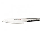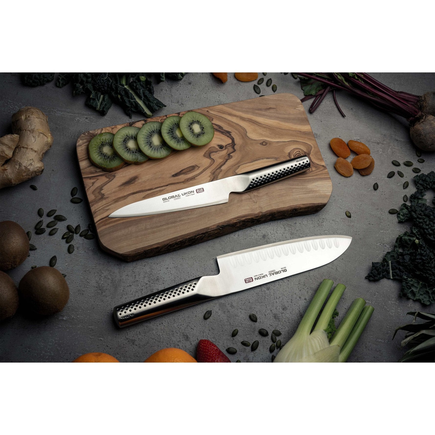 The Global Ukon GU-04 Santoku Knife is a versatile all-purpose knife that can chop, slice and dice most vegetables, meat and fish. The word Santoku means ‘three qualities’ in Japanese and some would say this relates this to the three key prepping techniques mentioned above. The fluted edge on the blade creates little air pockets when you chop, to reduce friction and sticking of foods.