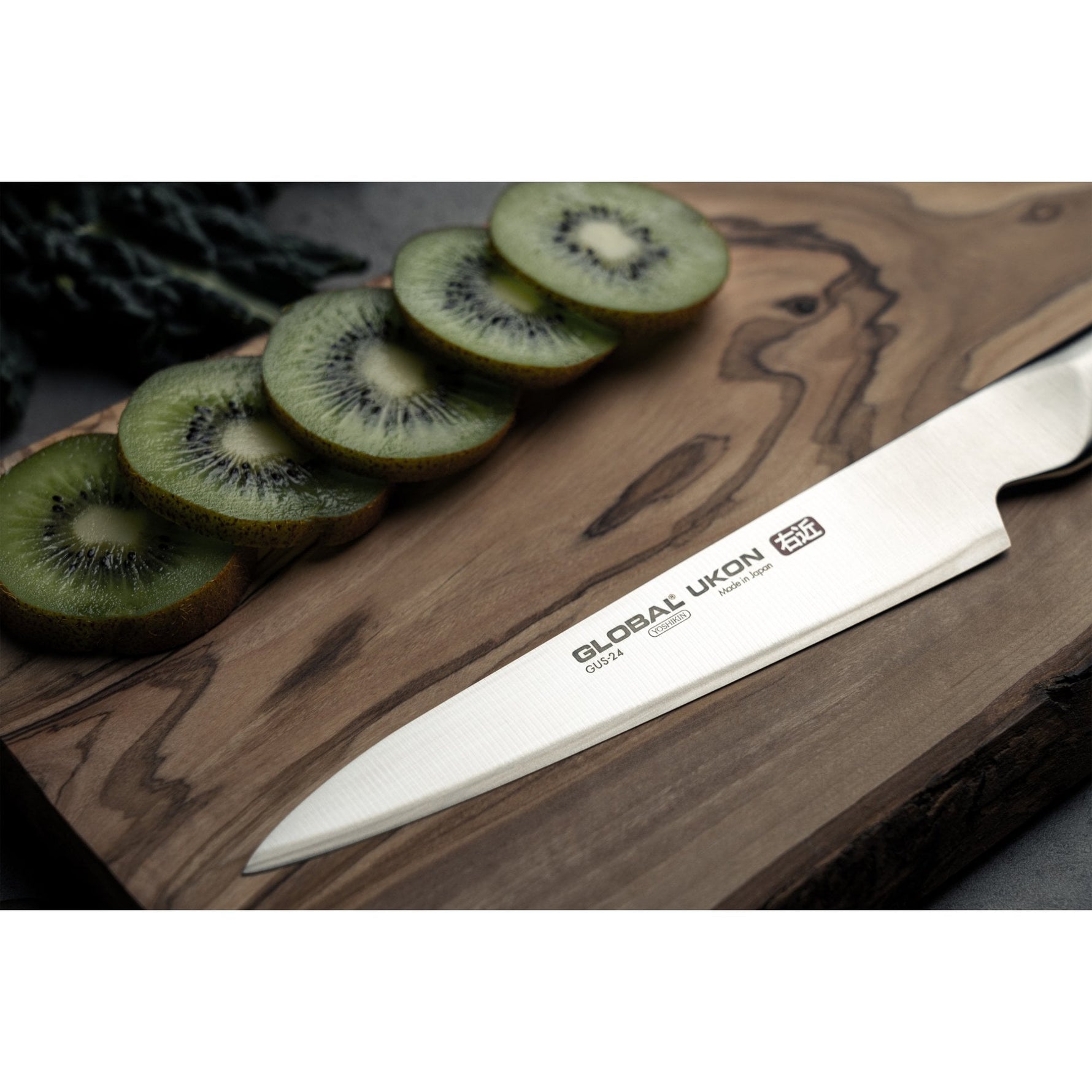 The Global Ukon GUS-24 Utility Knife is great for chopping smaller foods such as shallots, avocado and cheese. This multiskilled knife shares many qualities of a chef’s knife but is well suited to working with smaller food items, allowing for more precise, delicate cutting work. The GUS-24 Utility Knife is also useful as a small carving knife.