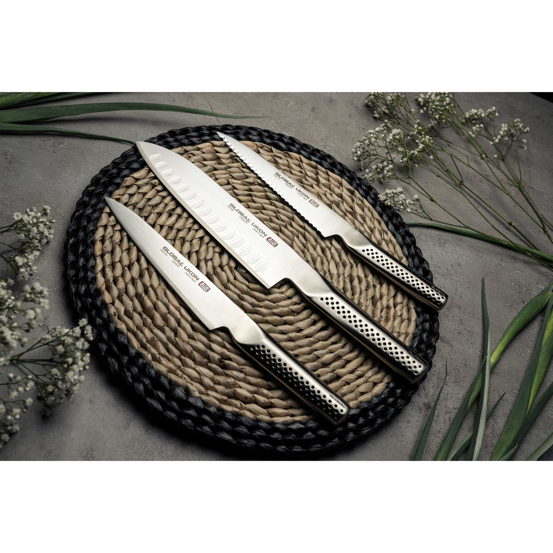 In true GLOBAL tradition, the knife is constructed from the best Stainless Steel material and the UKON series features thicker blades to enhance performance. UKON knives are subject to even more precise grinding and finishing work, making them 10 percent sharper out of the box. The knives are designed with an ambidextrous thumb rest that sits closer to the blade for added control and efficiency. The underside of the handle features GLOBAL's trademark indentations, making UKON knives extremely comfortable to hold.