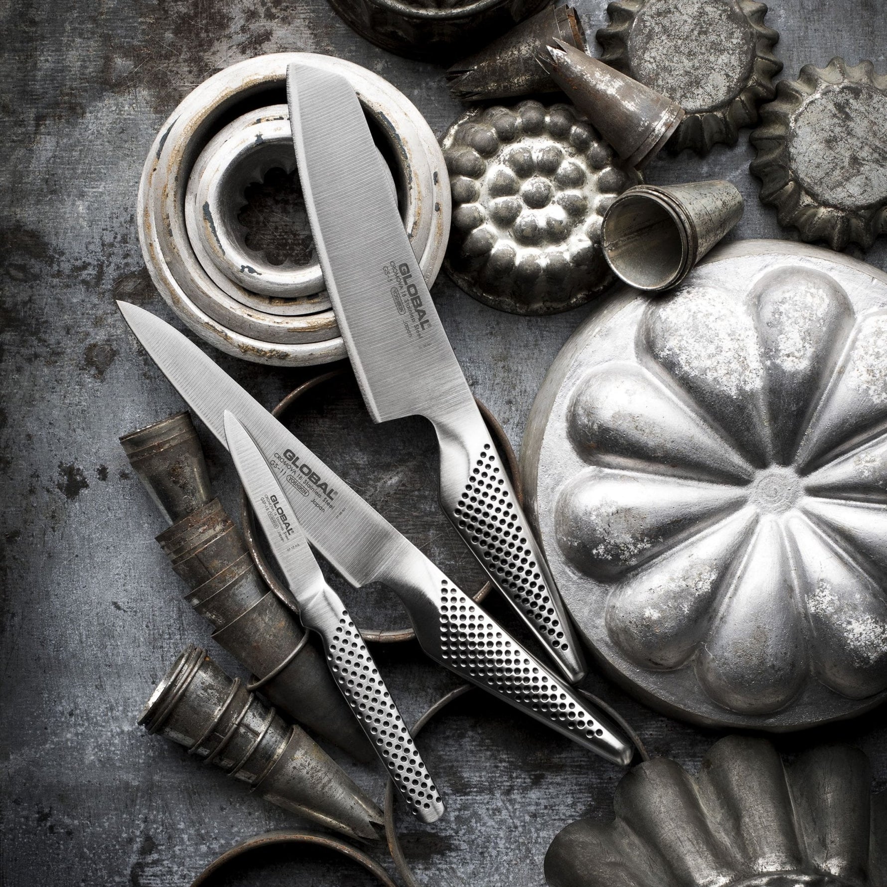 The GS-5 is the little brother of the G-5 vegetable chopper, with the same shape of blade in a smaller proportion. These knives take their inspiration from Japanese Usaba (Vegetable Knives), the relatively flat parts of the blade are designed to chop through fruit and vegetables and come into full contact with the chopping board and give a clean cut. The front of the blades are more curved like a chef's knife, to allow the knife to be rocked gently forward after each cut and encourage good technique. A really popular blade often found in Global sets, the GS-5 is also available in a fluted style as the GS-39.